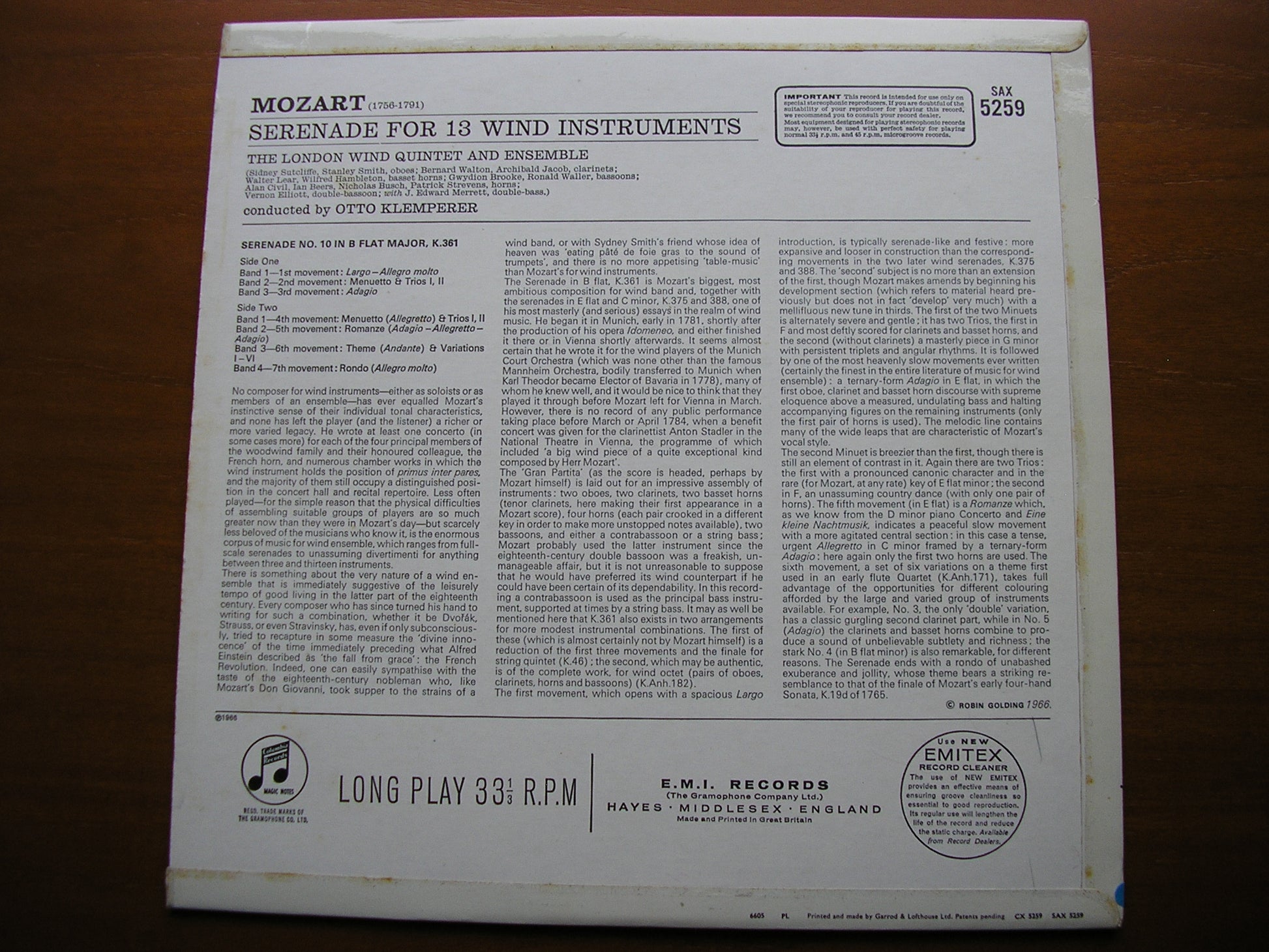 MOZART: SERENADE No. 10 FOR 13 WIND INSTRUMENTS K361 OTTO KLEMPERER / THE LONDON WIND QUINTET & ENSEMBLE SAX 5259