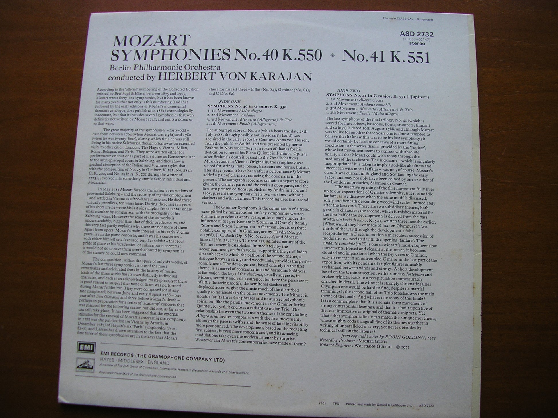 ASD 2732  MOZART: SYMPHONIES Nos. 40 & 41 'Jupiter'      HERBERT VON KARAJAN / BERLIN PHILHARMONIC ORCHESTRA