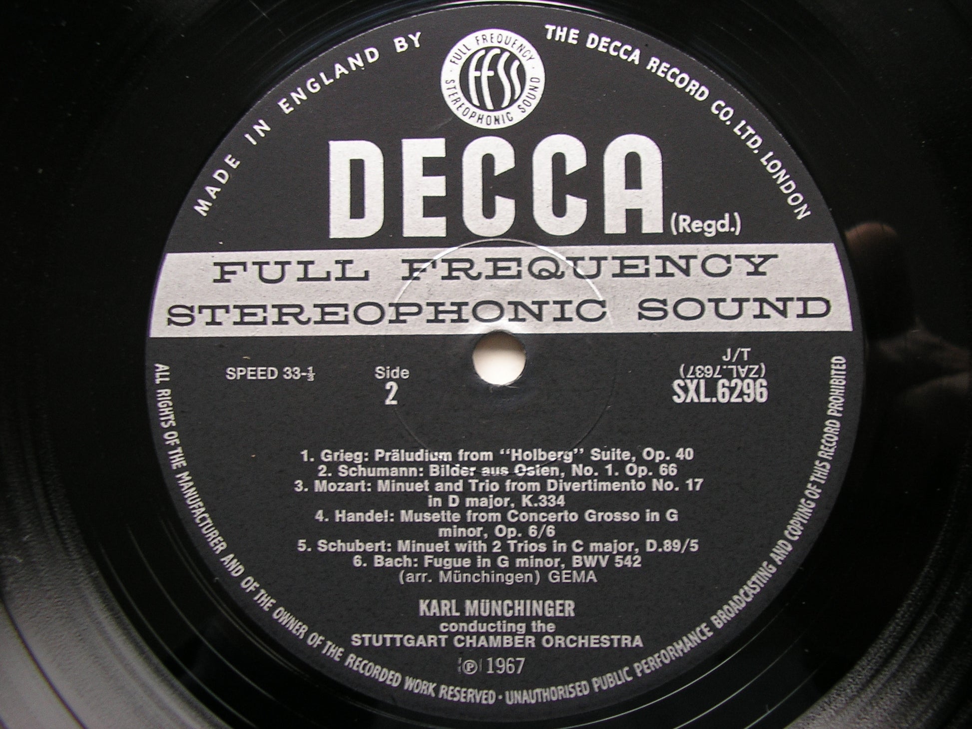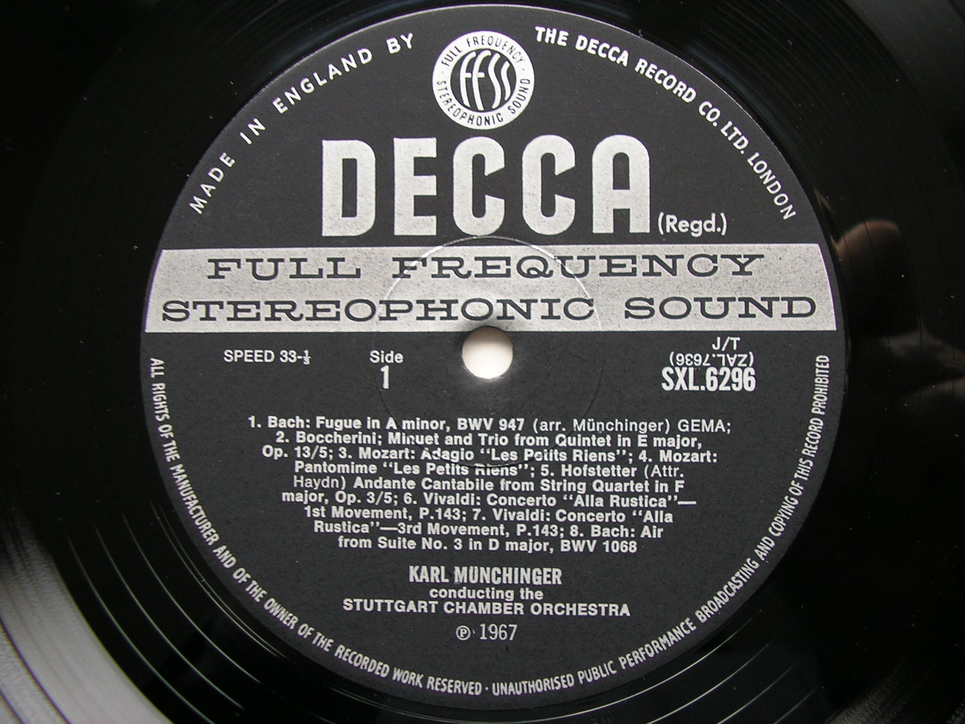 SXL 6296  BACH / BOCCHERINI / MOZART / HOFSTETTER / VIVALDI / SCHUBERT / GRIEG / SCHUMANN: ORCHESTRAL WORKS    KARL MUNCHINGER / STUTTGART CHAMBER ORCHESTRA
