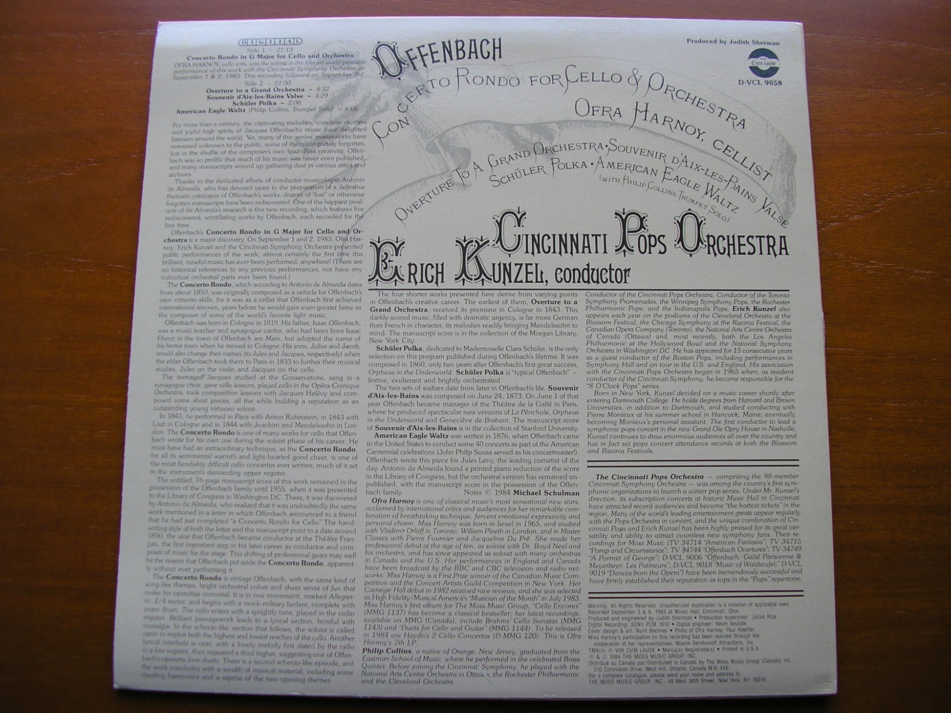 D-VCL 9058  OFFENBACH: CONCERTO RONDO for CELLO & ORCHESTRA / SOUVENIR / AMERICAN EAGLE WALTZ / SCHULER POLKA     OFRA HARNOY / CINCINNATI POPS ORCHESTRA / ERICH KUNZEL