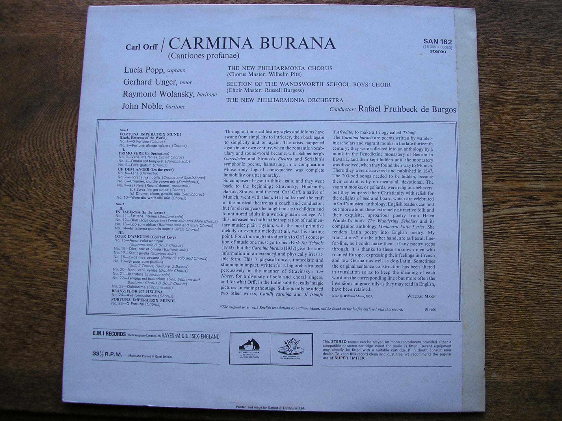 SAN 162  ORFF: CARMINA BURANA  LUCIA POPP / GERHARD UNGER / JOHN NOBLE / RAYMOND WOLANSKY / NEW PHILHARMONIA ORCHESTRA / RAFAEL FRUHBECK DE BURGOS