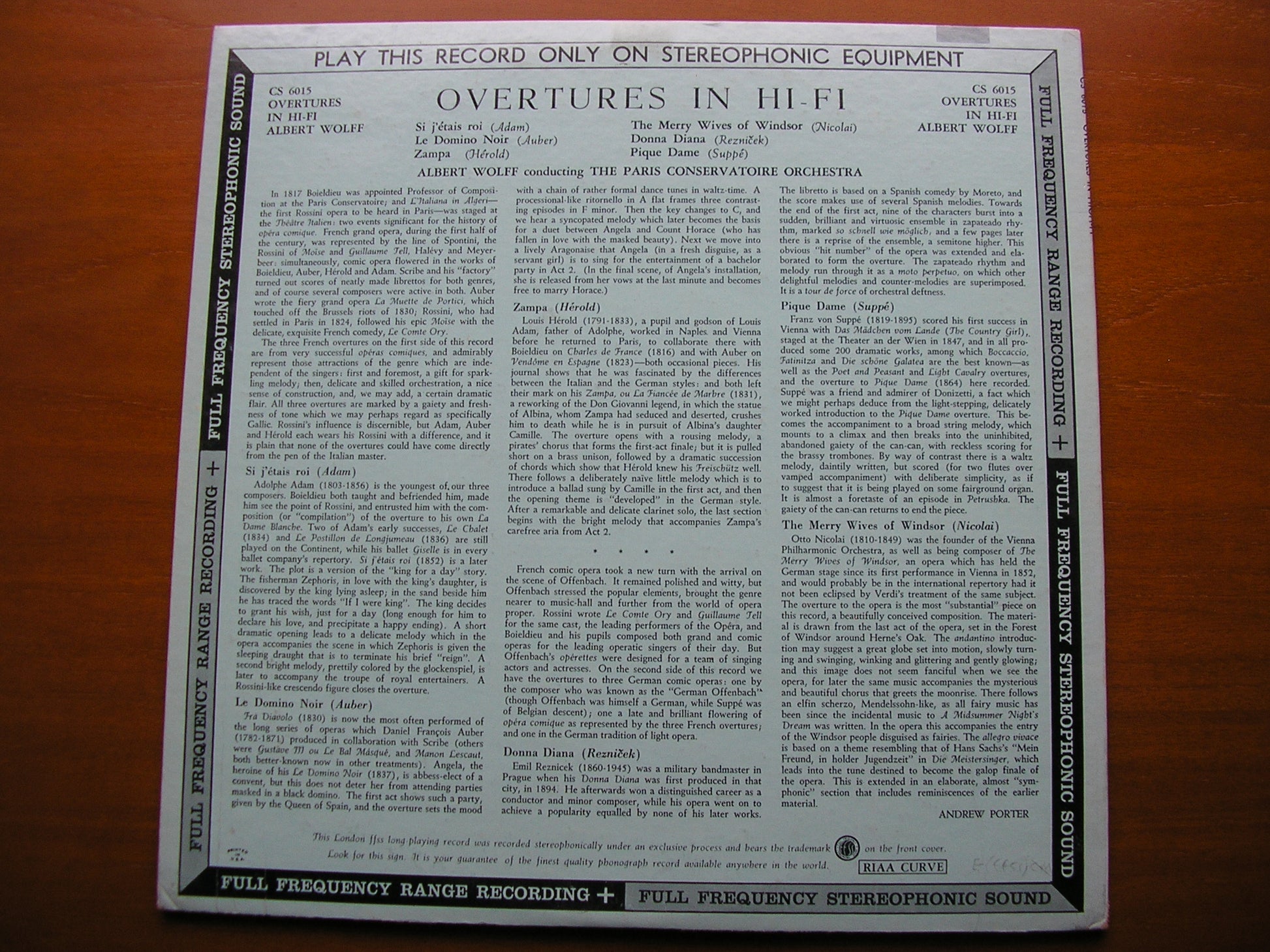 CS 6015  OVERTURES IN HI - FI: ADAM / AUBER / HEROLD / NICOLAI / REZNICEK / SUPPE  ALBERT WOLFF / PARIS CONSERVATOIRE ORCHESTRA