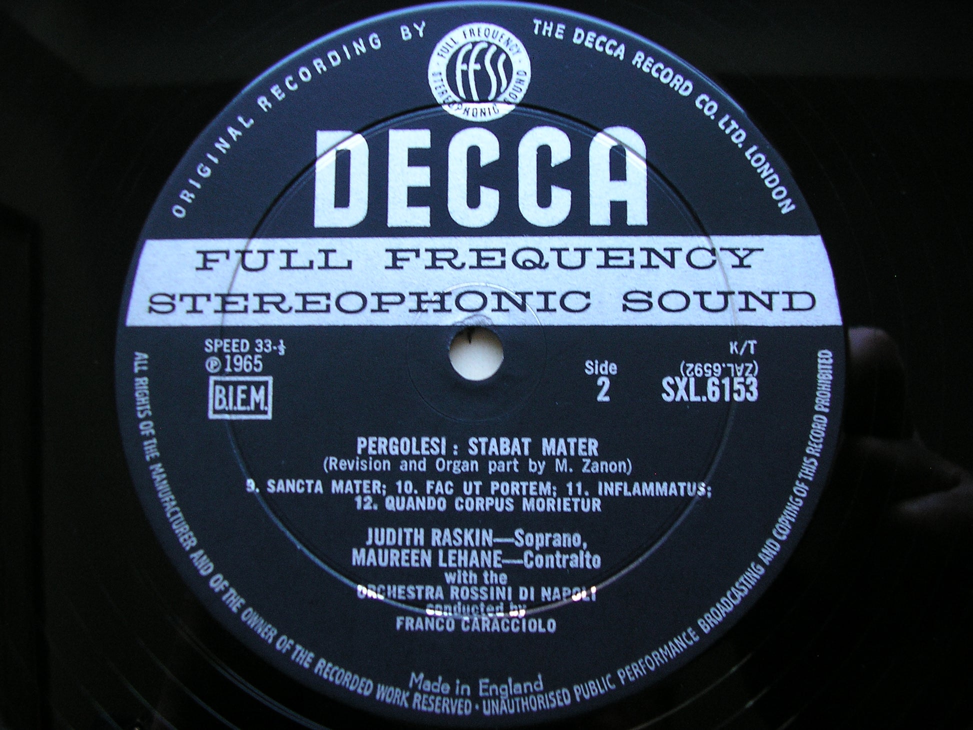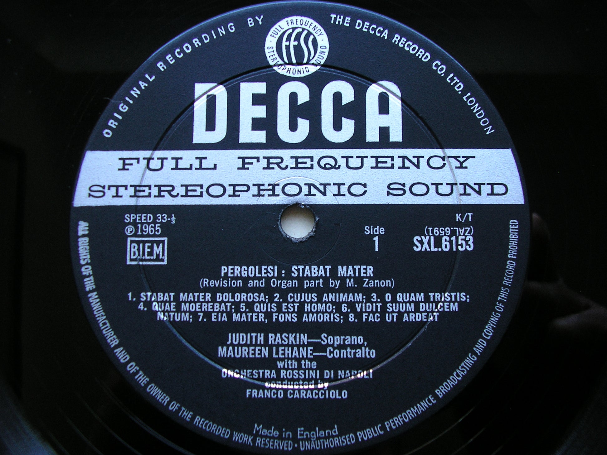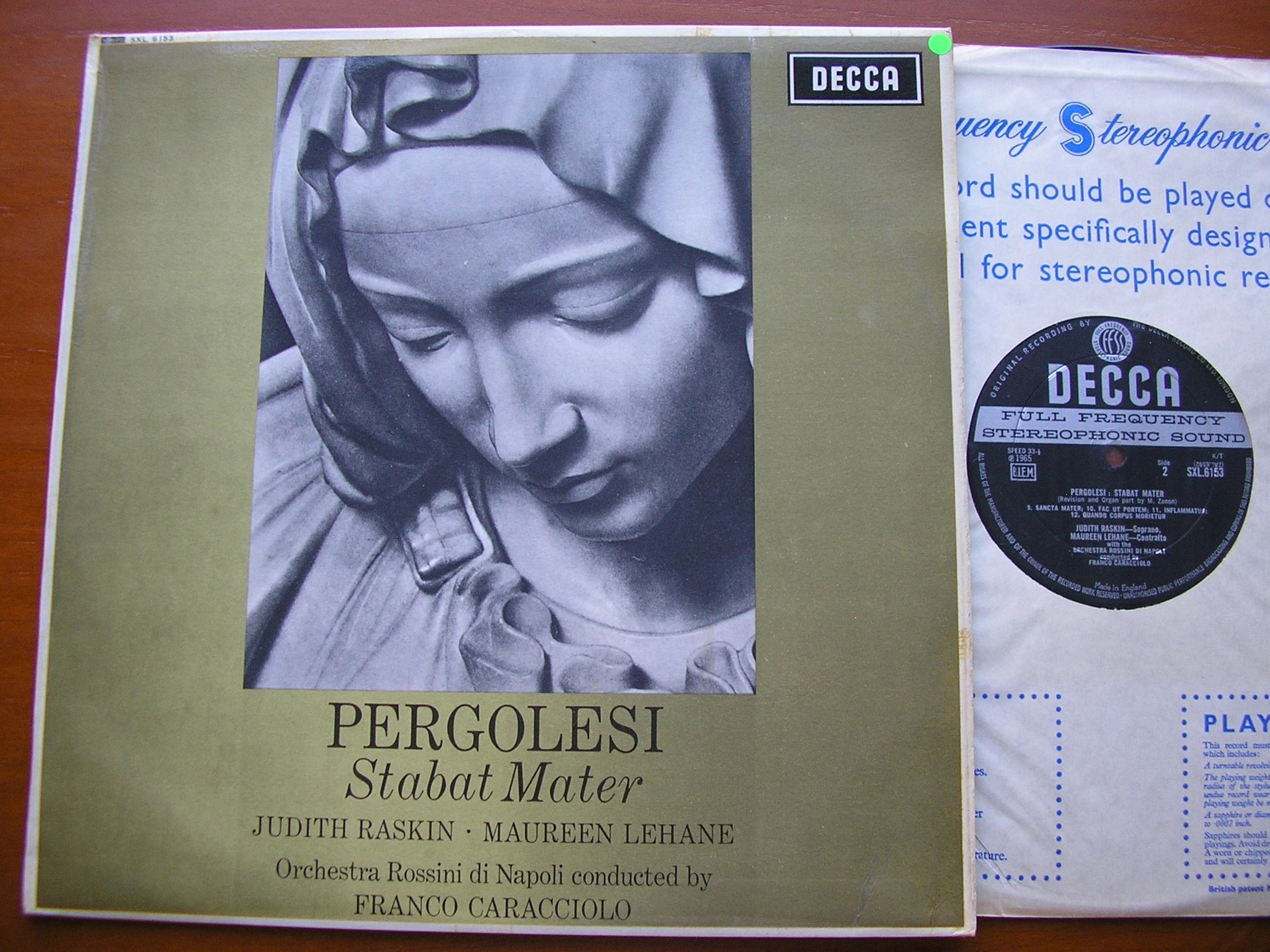 SXL 6153  PERGOLESI: STABAT MATER   JUDITH RASKIN / MAUREEEN LEHANE / NAPLES ROSSINI ORCHESTRA / FRANCO CARACCIOLO