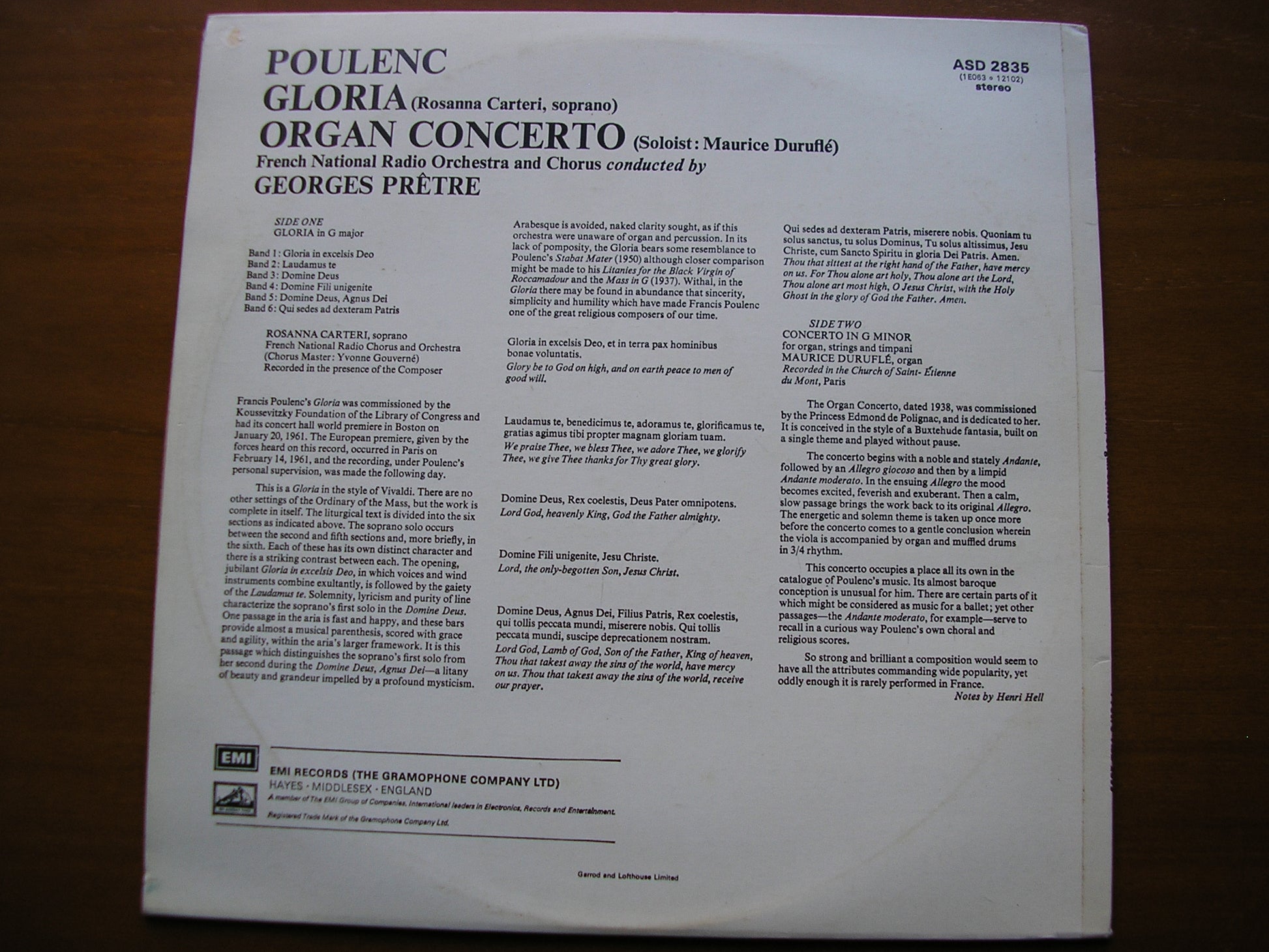 POULENC: GLORIA / ORGAN CONCERTO DURUFLE / CARTERI / FRENCH NATIONAL RADIO ORCHESTRA / PRETRE ASD 2835