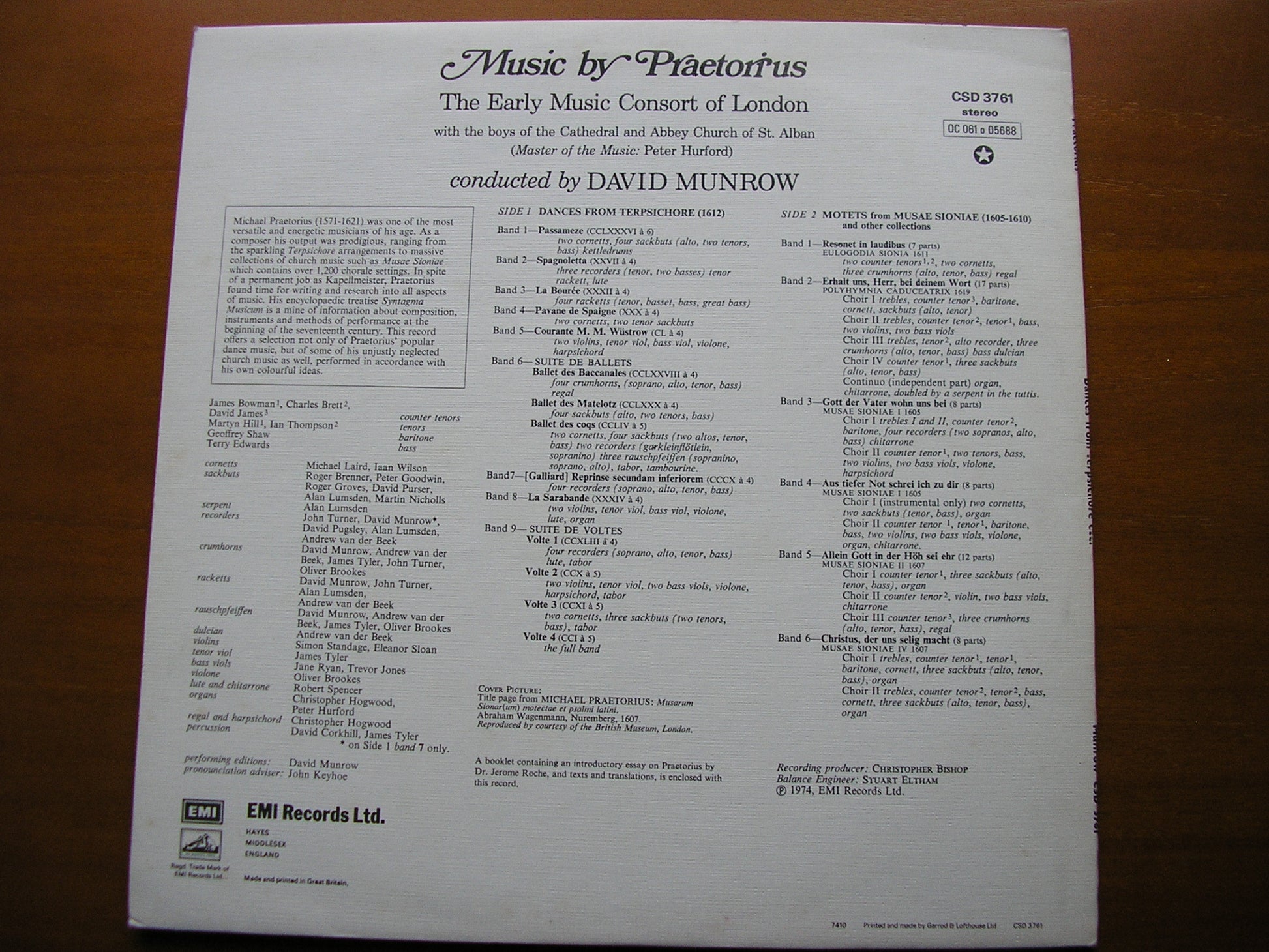 CSD 3761  PRAETORIUS: DANCES FROM THE TERPSICHORE / MOTETS from MUSAE SIONIAE        DAVID MUNROW / THE EARLY MUSIC CONSORT OF LONDON