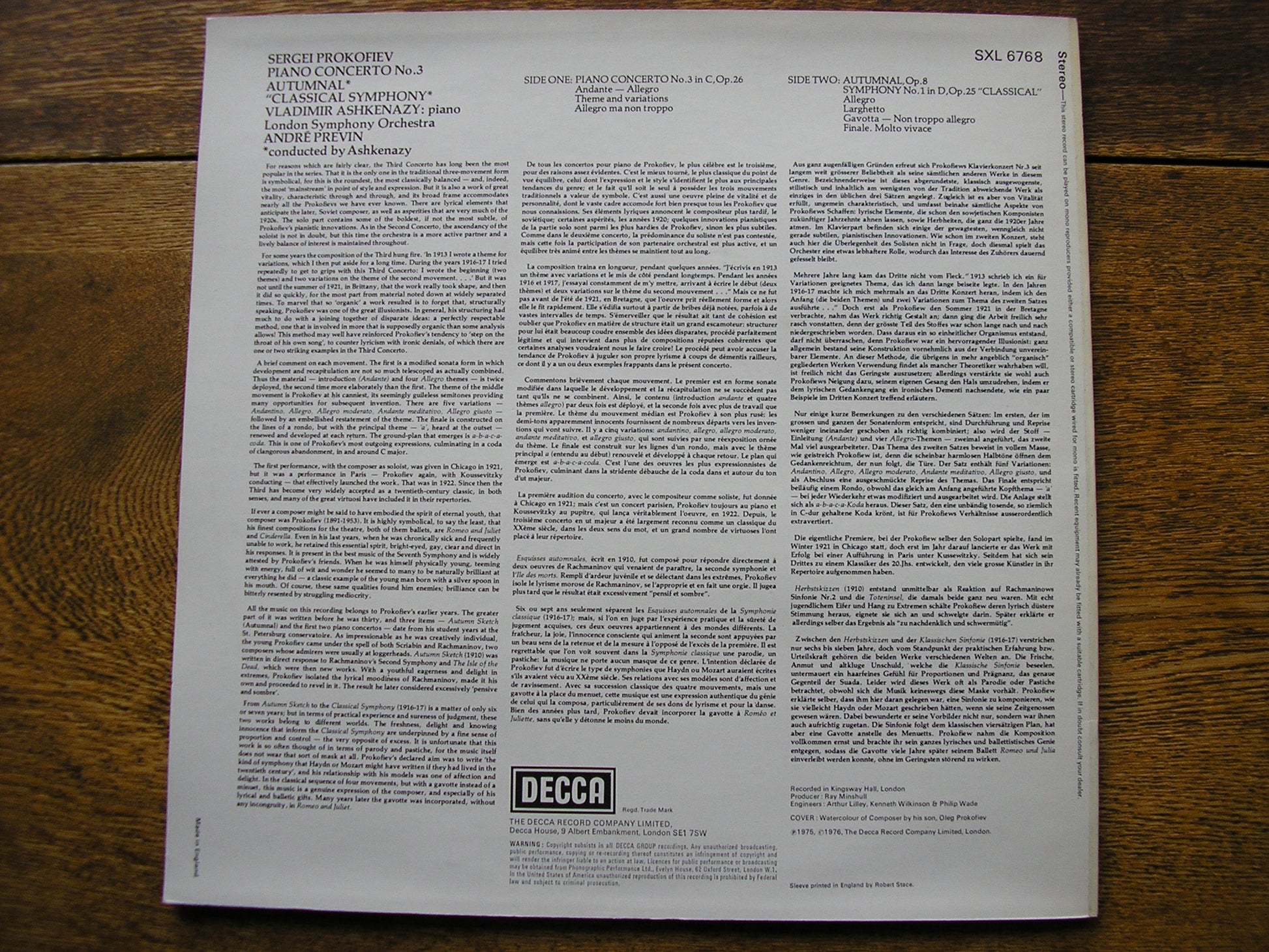 SXL 6768  PROKOFIEV: PIANO CONCERTO No. 3 / CLASSICAL SYMPHONY   VLADIMIR ASHKENAZY / LONDON SYMPHONY ORCHESTRA / ANDRE PREVIN
