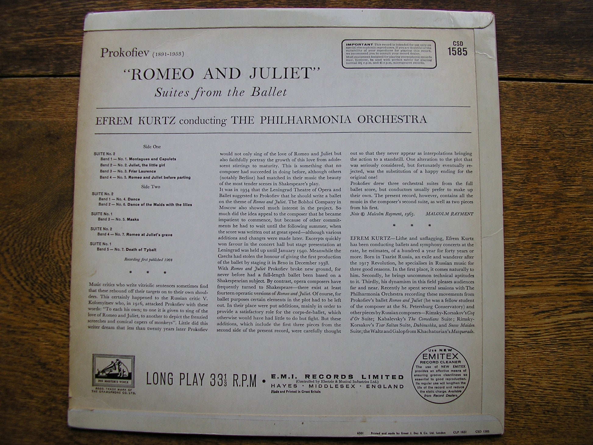 CSD 1585  PROKOFIEV: ROMEO & JULIET Ballet Suites   EFREM KURTZ / PHILHARMONIA ORCHESTRA
