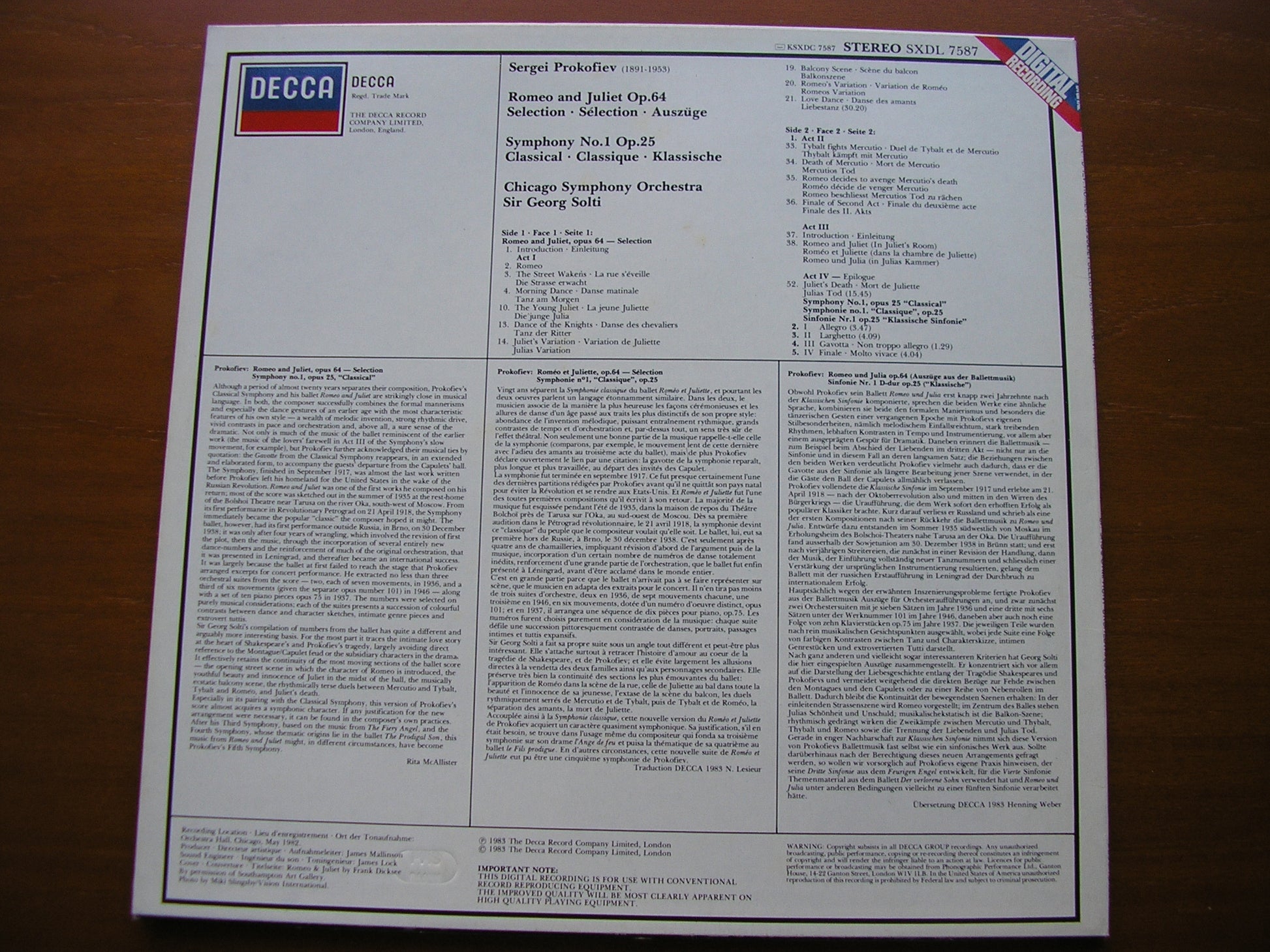 SXDL 7587  PROKOFIEV: ROMEO & JULIET excerpts / SYMPHONY No, 1 'Classical'   SIR GEORG SOLTI / CHICAGO SYMPHONY ORCHESTRA