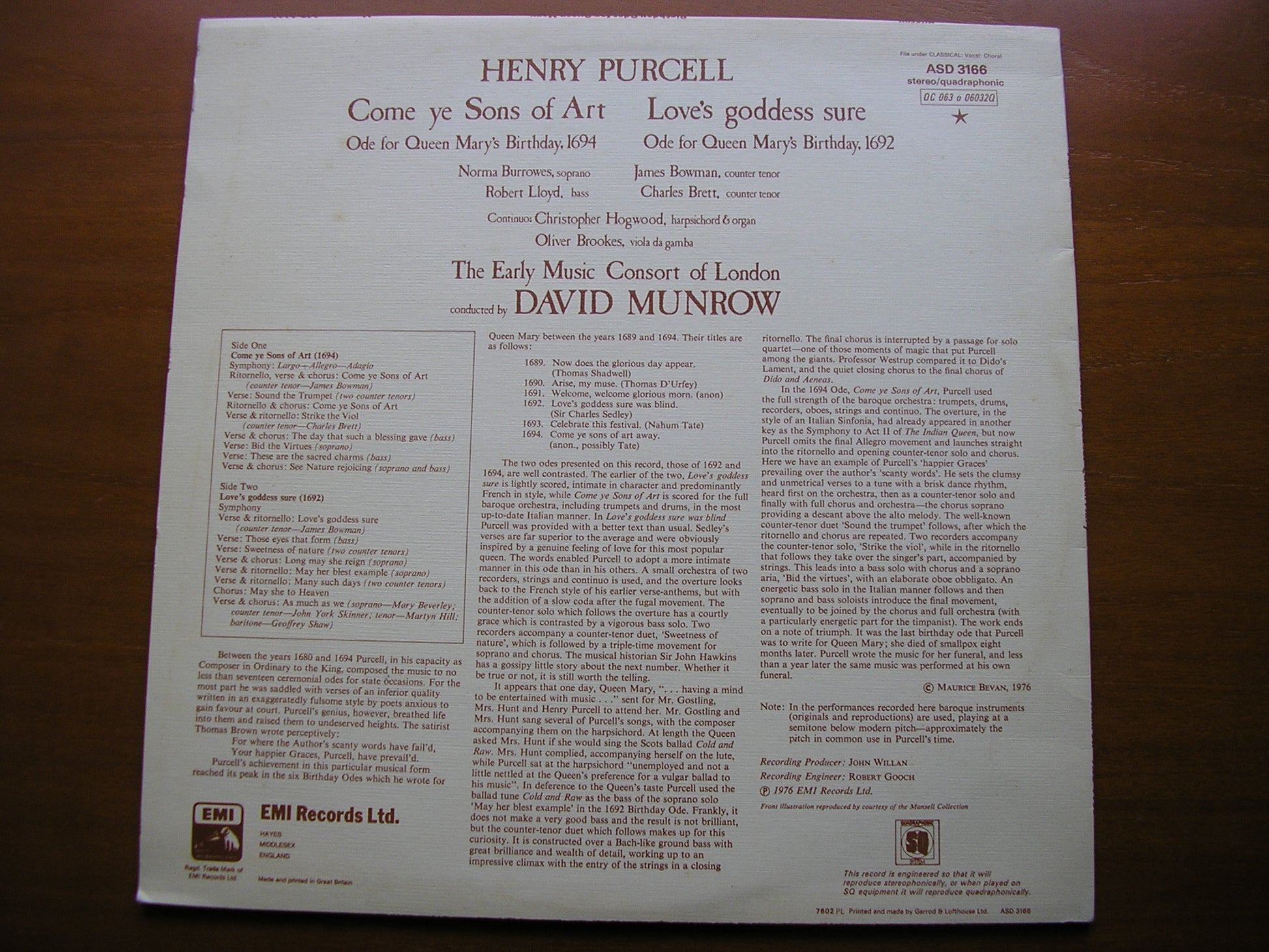ASD 3166  PURCELL: BIRTHDAY ODES FOR QUEEN MARY Come Ye Sons of Art / Love's Goddess Sure      SOLOISTS / THE EARLY MUSIC CONSORT OF LONDON / DAVID MUNROW