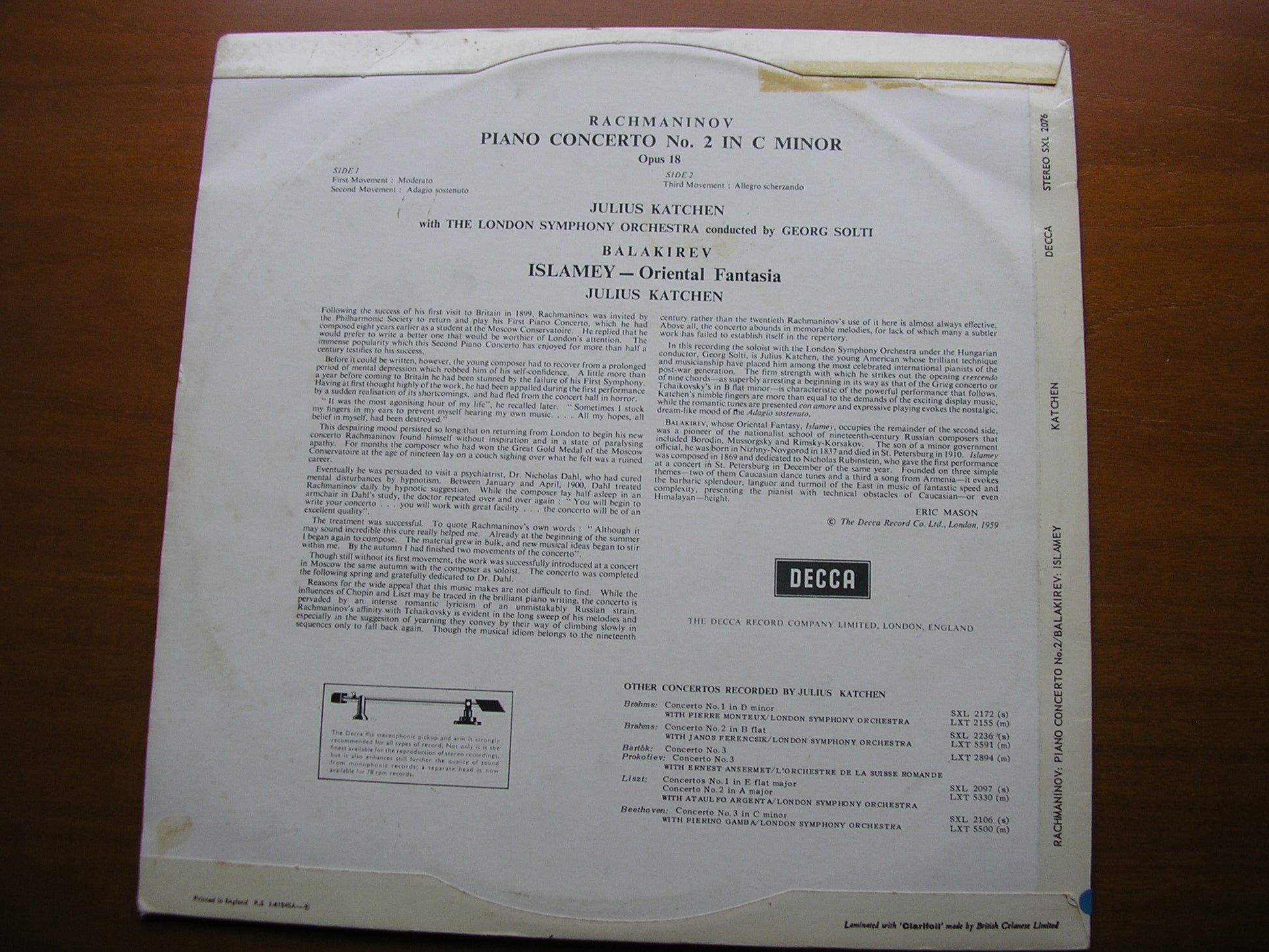 SXL 2076  RACHMANINOV: PIANO CONCERTO No. 2 / BALAKIREV: ISLAMEY   JULIUS KATCHEN / LONDON SYMPHONY ORCHESTRA / GEORG SOLTI