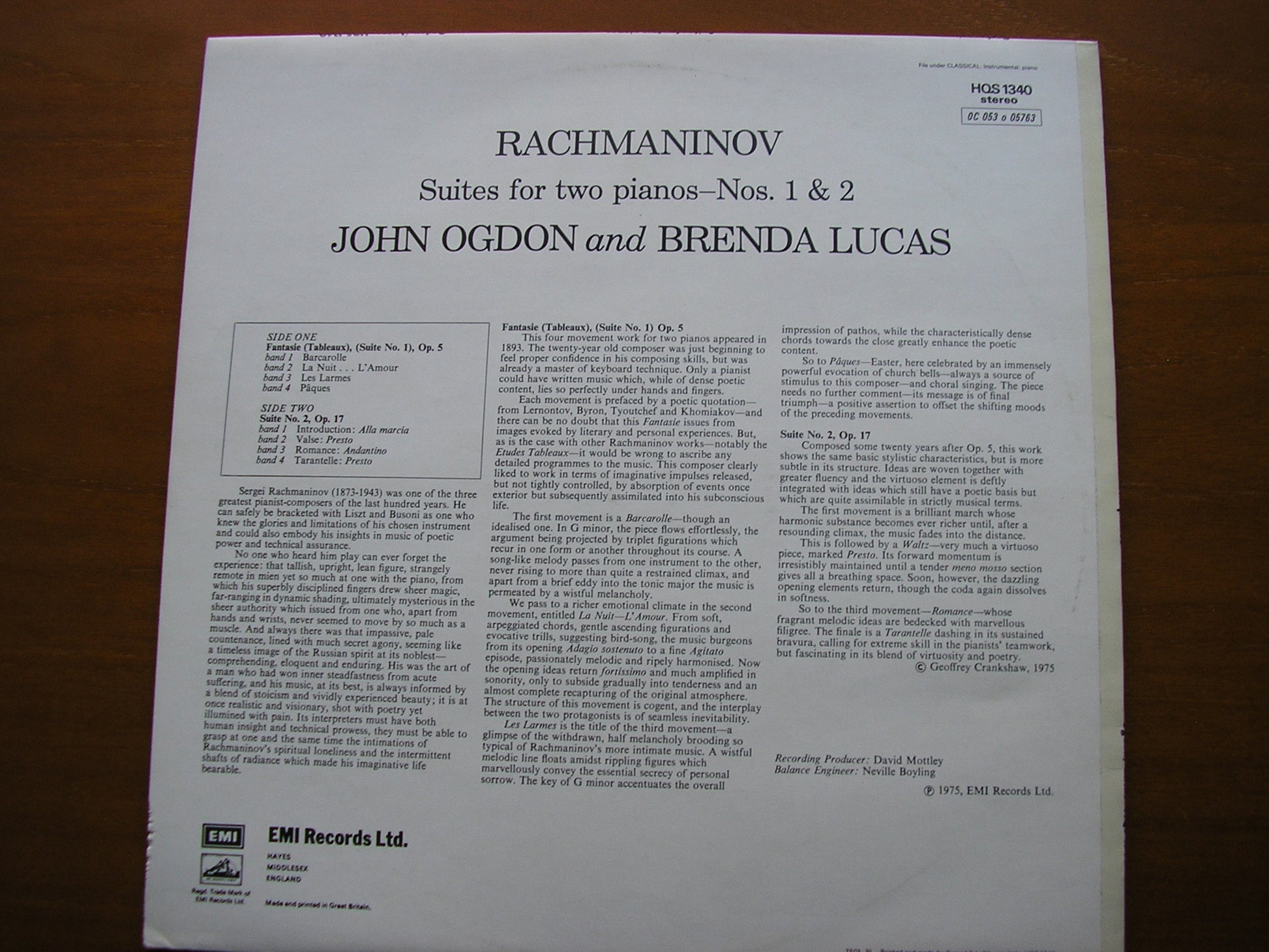 HQS 1340  RACHMANINOV: SUITES FOR TWO PIANOS     JOHN OGDON / BRENDA LUCAS