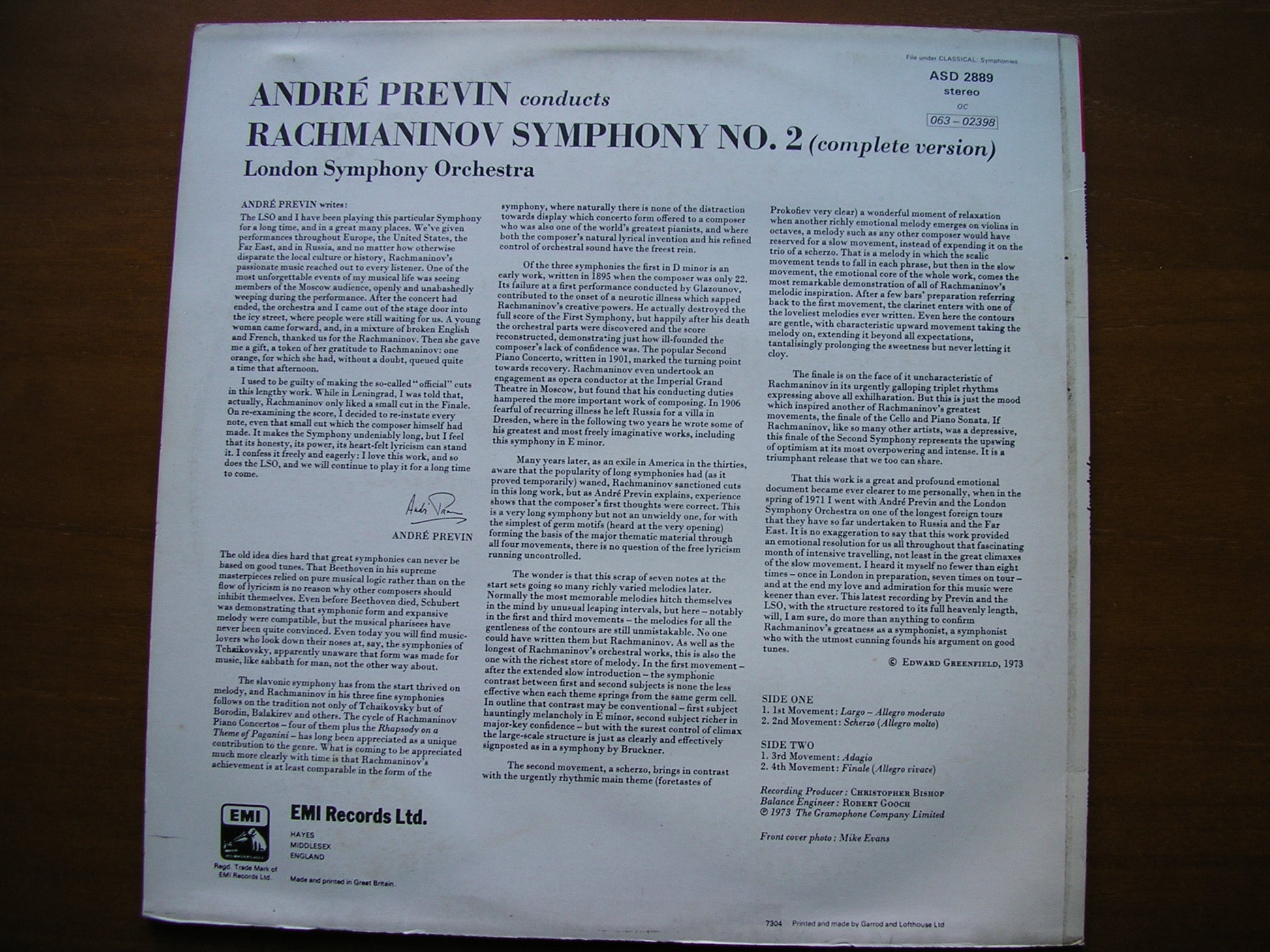 ASD 2889  RACHMANINOV: SYMPHONY No. 2      ANDRE PREVIN / LONDON SYMPHONY ORCHESTRA