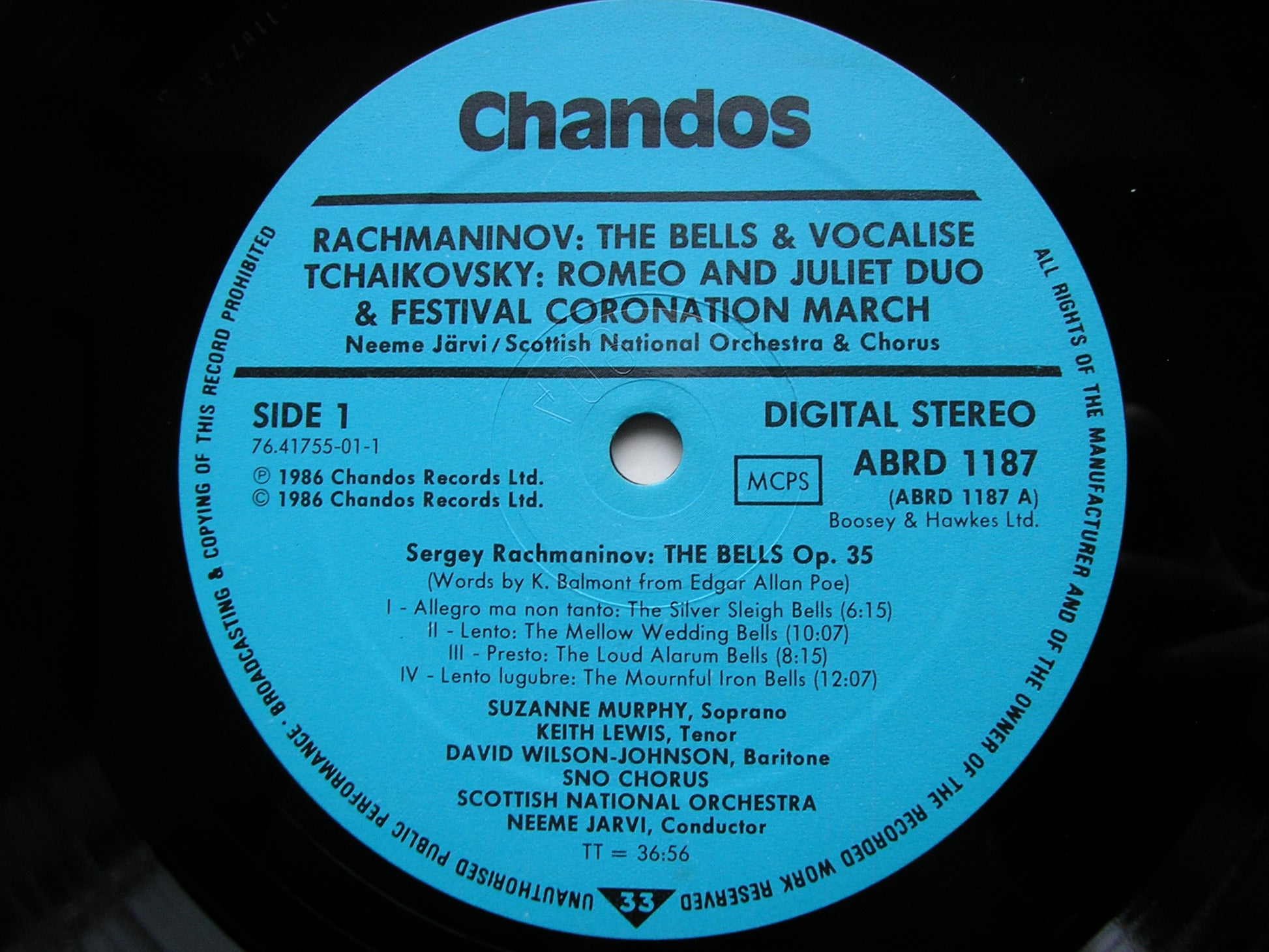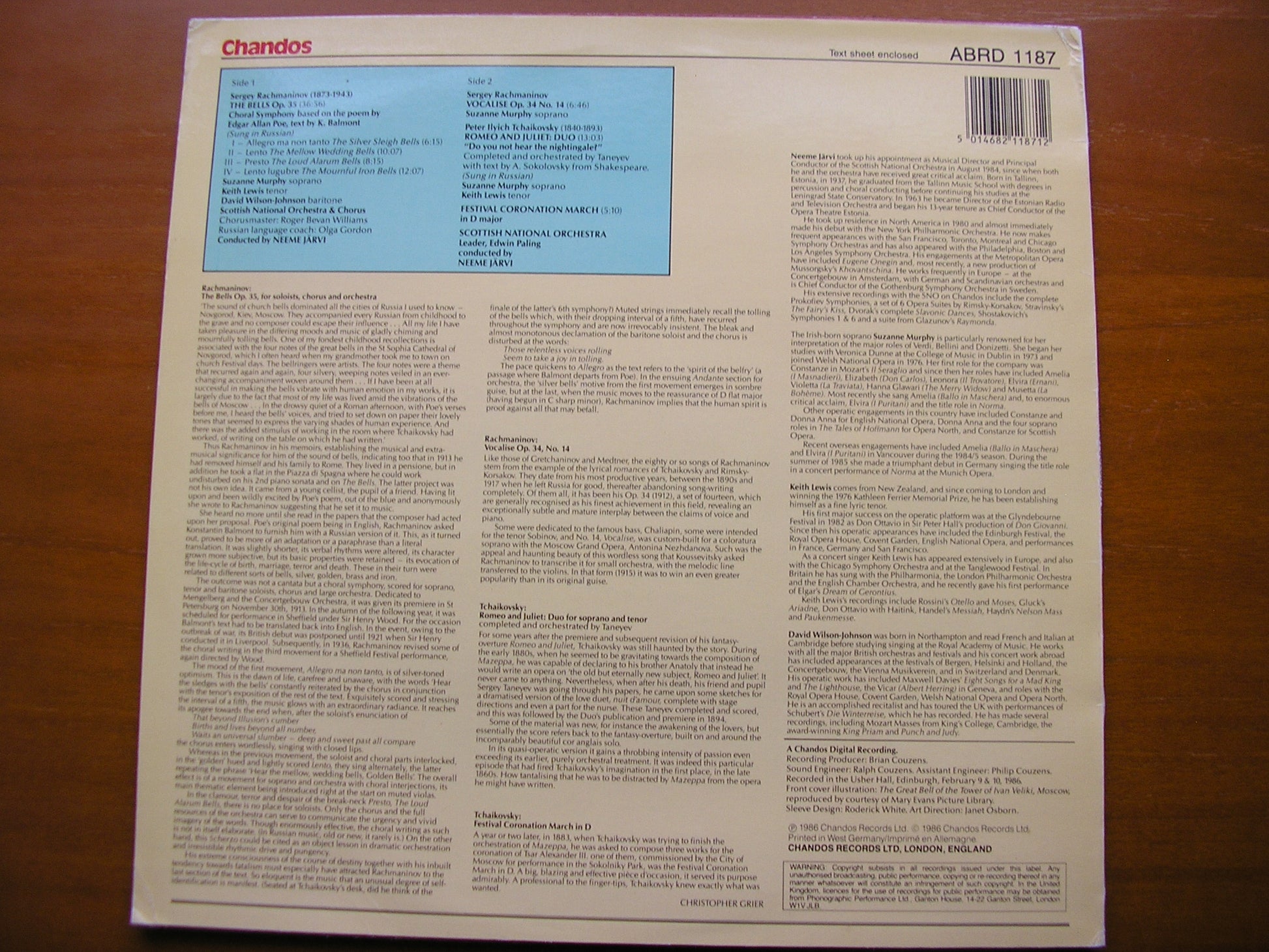 ABRD 1187 RACHMANINOV: THE BELLS / VOCALISE    SOLOISTS / SCOTTISH NATIONAL ORCHESTRA & CHORUS    TCHAIKOVSKY: ROMEO & JULIET DUO     SUZANNE MURPHY & KEITH LEWIS / FESTIVAL CORONATION MARCH    SNO / NEEME JARVI