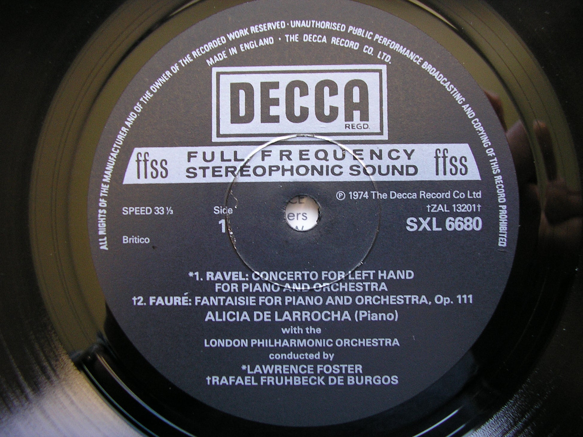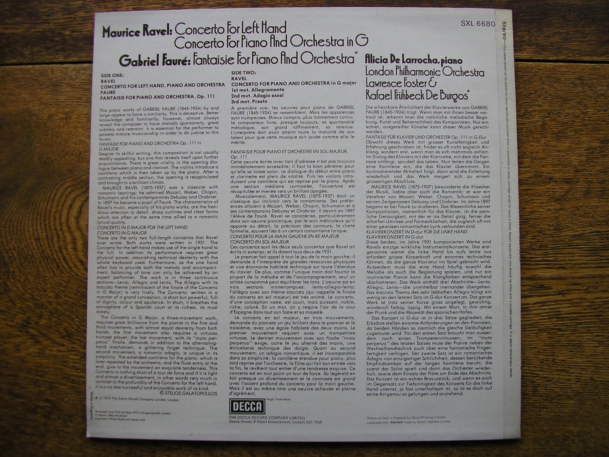 SXL 6680  RAVEL: PIANO CONCERTOS / FAURE: FANTAISIE FOR PIANO & ORCHESTRA*   ALICIA DE LARROCHA / LAWRENCE FOSTER / FRUHBECK DE BURGOS* / LONDON PHILHARMONIC ORCHESTRA