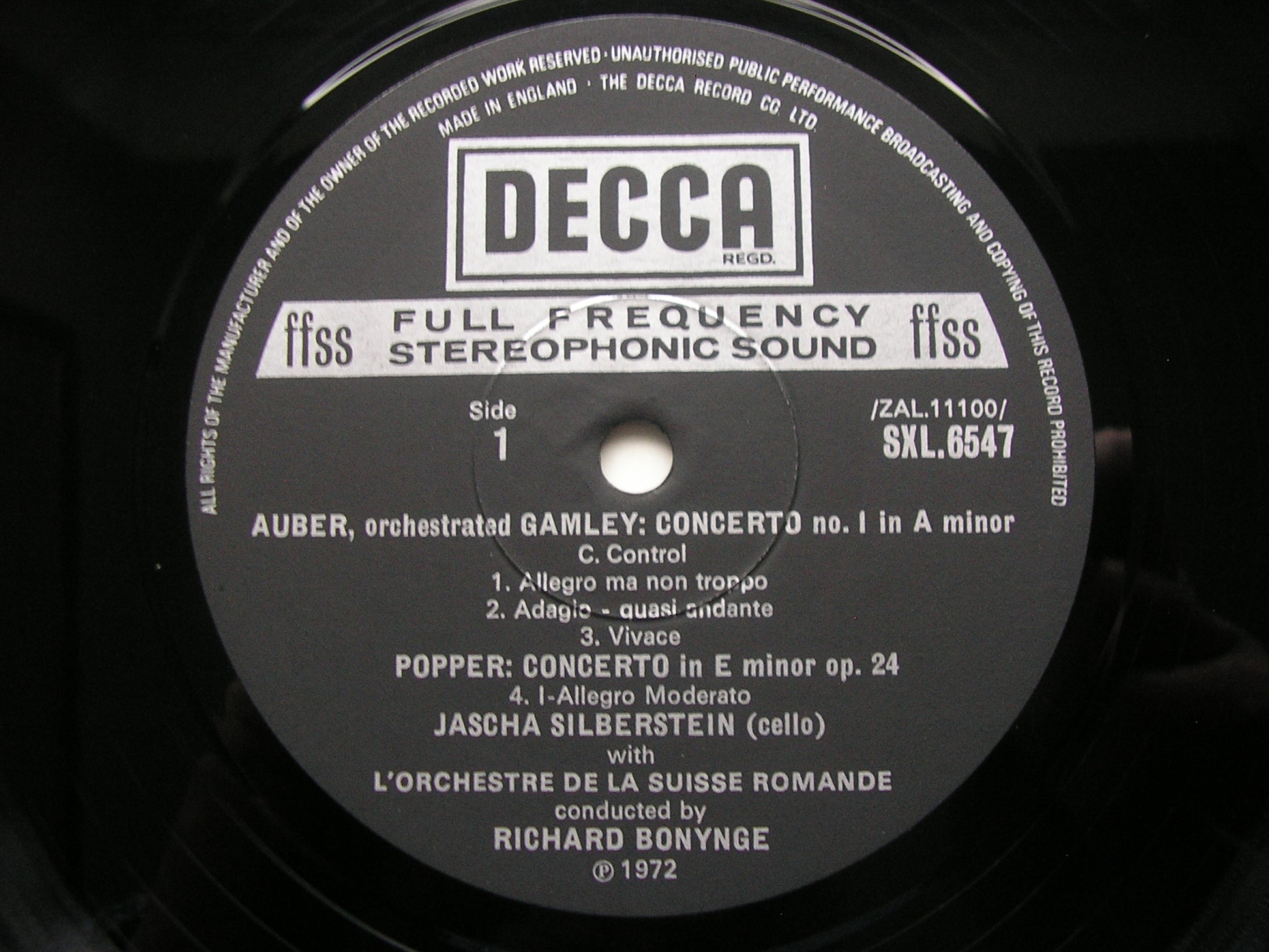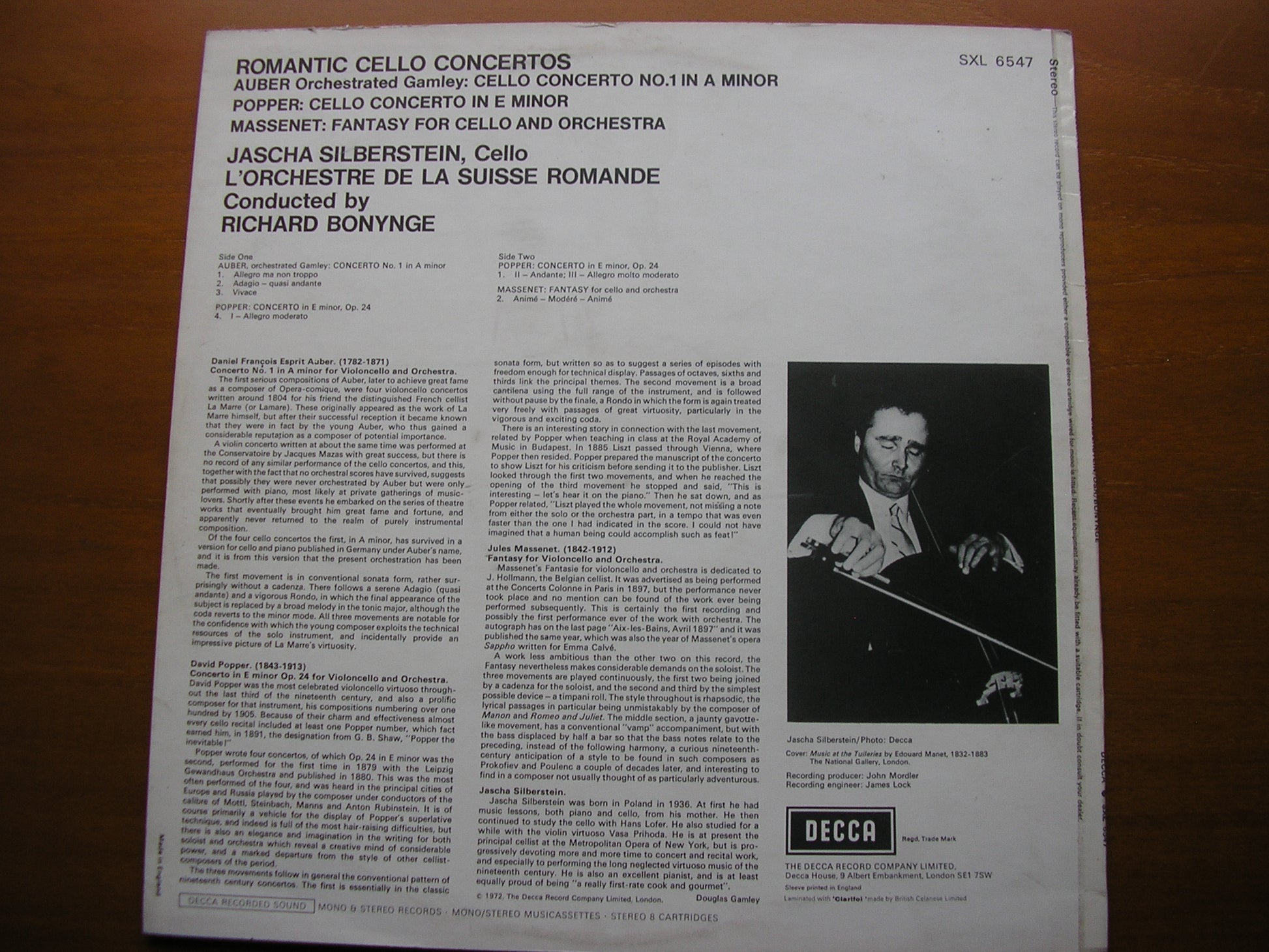 SXL 6547  CELLO CONCERTOS AUBER / POPPER / MASSENET     JASCHA SILBERSTEIN / SUISSE ROMANDE ORCHESTRA