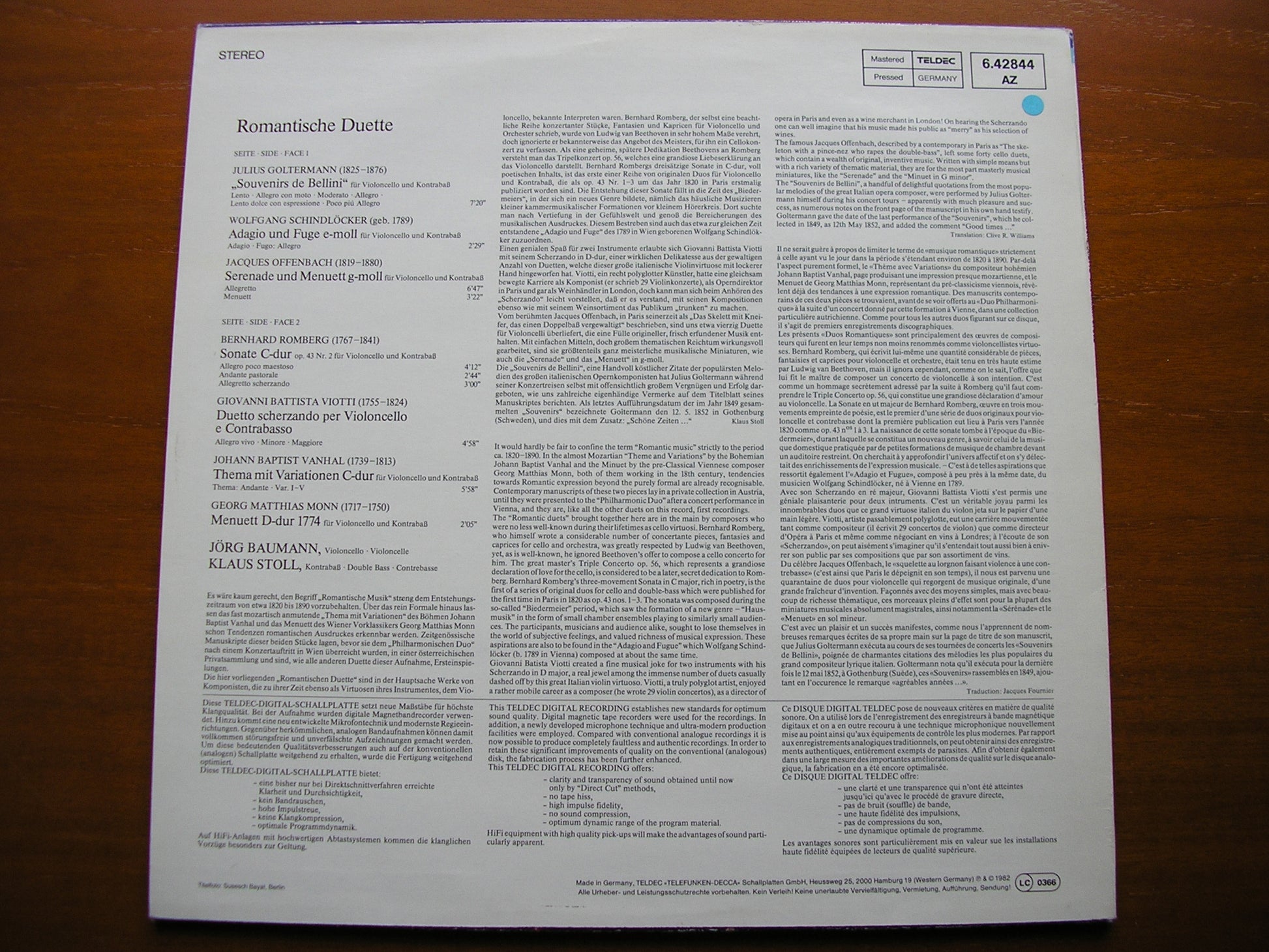 ROMANTIC DUETS FOR CELLO & DOUBLE BASS: OFFENBACH / ROMBERG / VANHAL / VIOTTI / MONN / GOLTERMANN STOLL / BAUMANN 6.42844