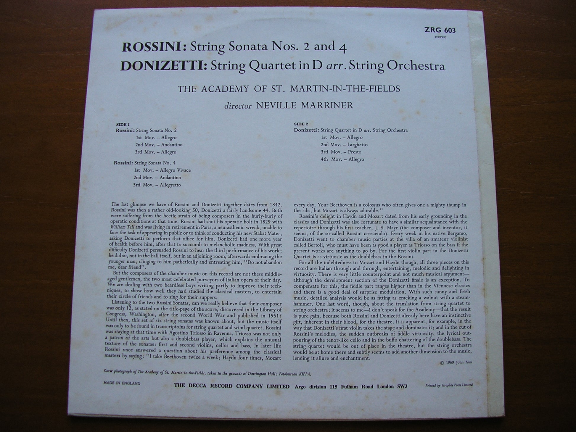 ZRG 603  ROSSINI: STRING SONATAS Nos. 2 & 4 / DONIZETTI: STRING QUARTET in D    NEVILLE MARRINER / ACADEMY OF SAINT MARTIN IN THE FIELDS