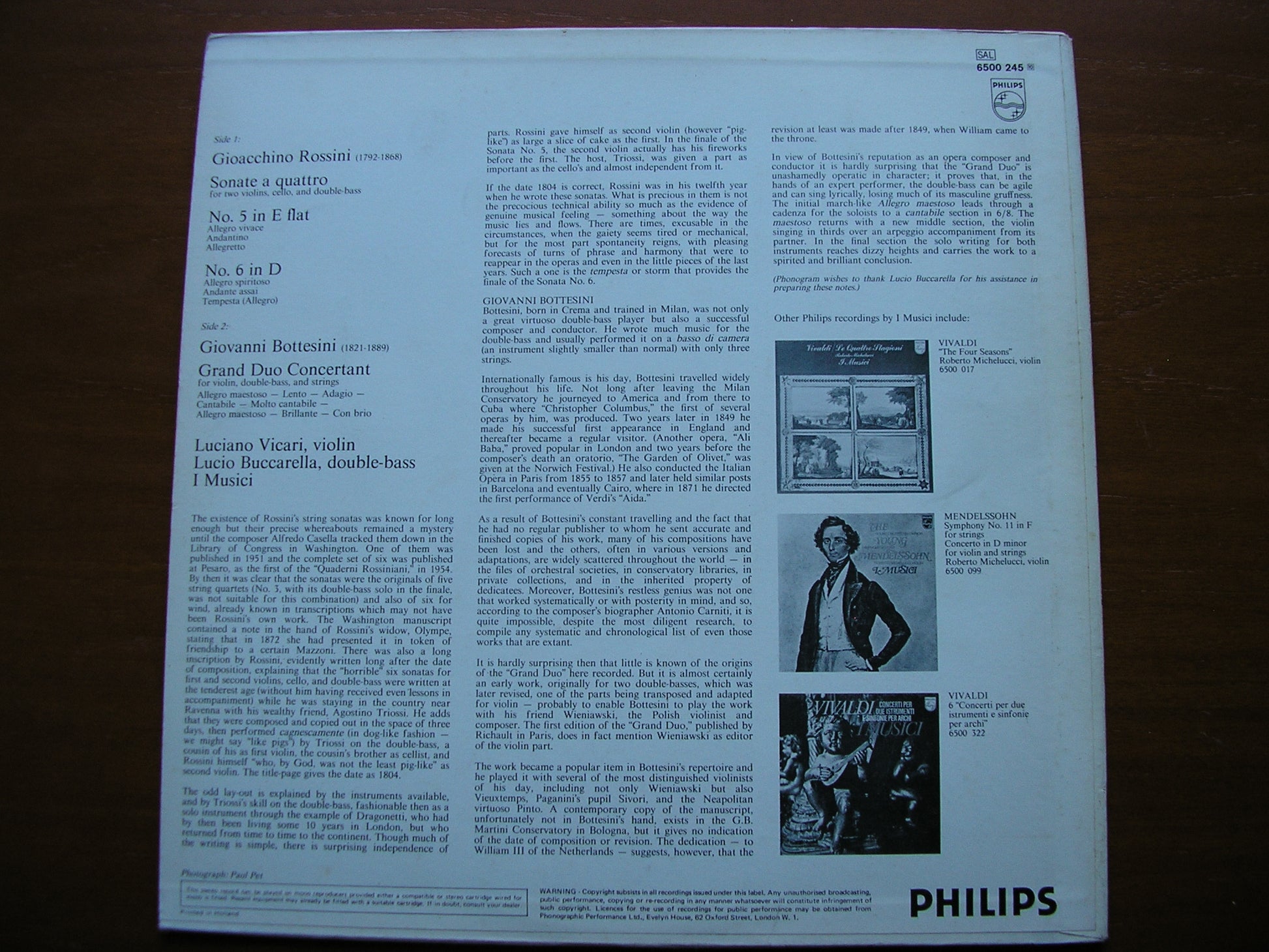 6500 245  ROSSINI: STRING SONATAS Nis. 5 & 6 / BOTTESINI: GRAND DUO CONCERTANTE      I MUSICI / LUCIANO VICARI / LUCIO BUCCARELLA