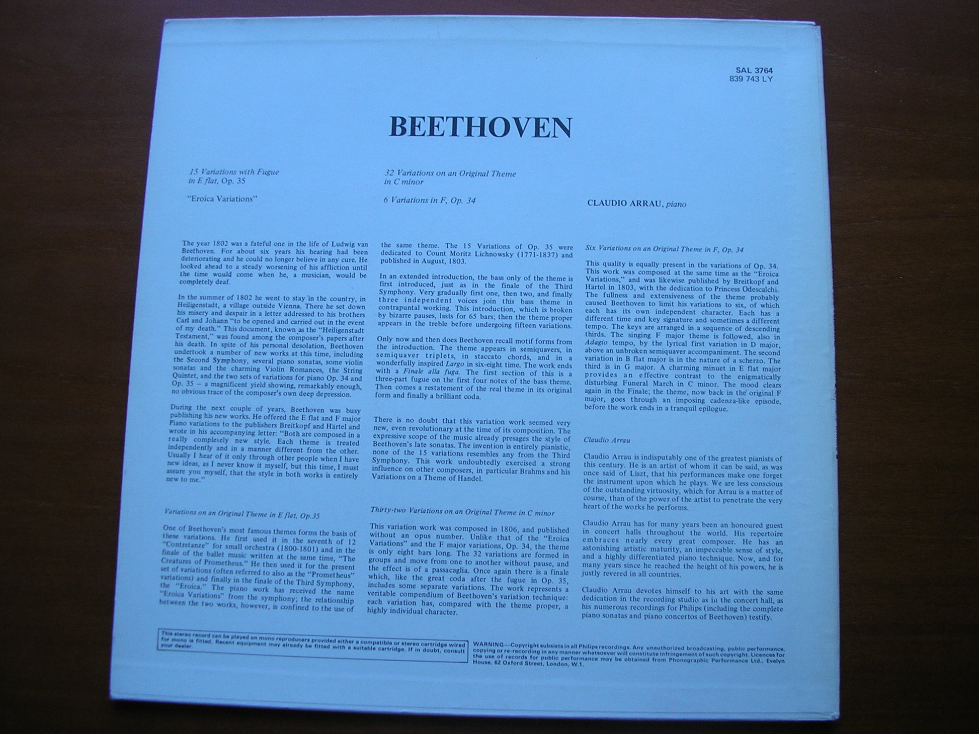 SAL 3764 BEETHOVEN: EROICA VARIATIONS / 32 VARIATIONS / 6 VARIATIONS Op. 34 CLAUDIO ARRAU SAL 3764