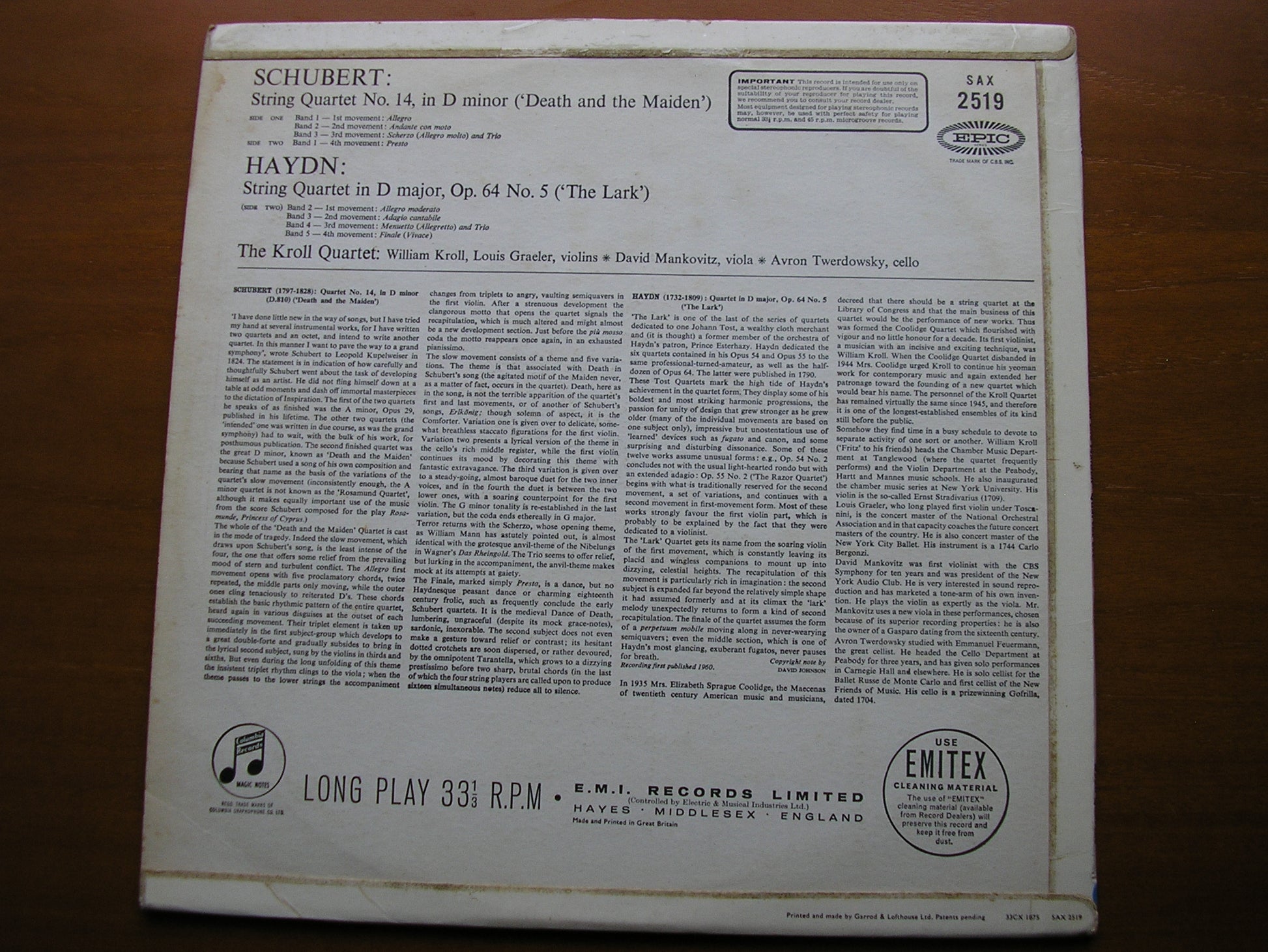 SAX 2519 SCHUBERT: STRING QUARTET in D  Op. Posth / HAYDN: STRING QUARTET in D  Op. 64  No. 5      THE KROLL QUARTET