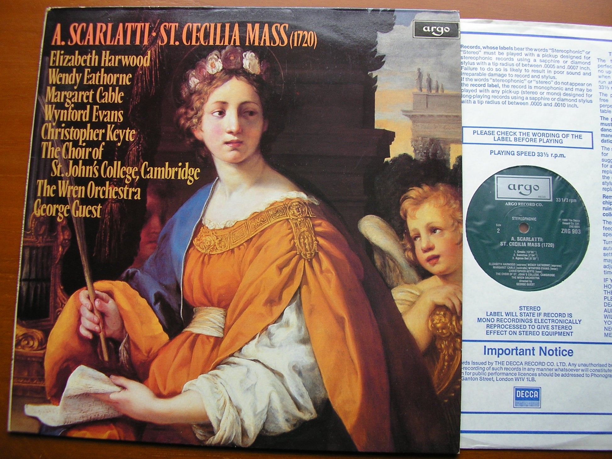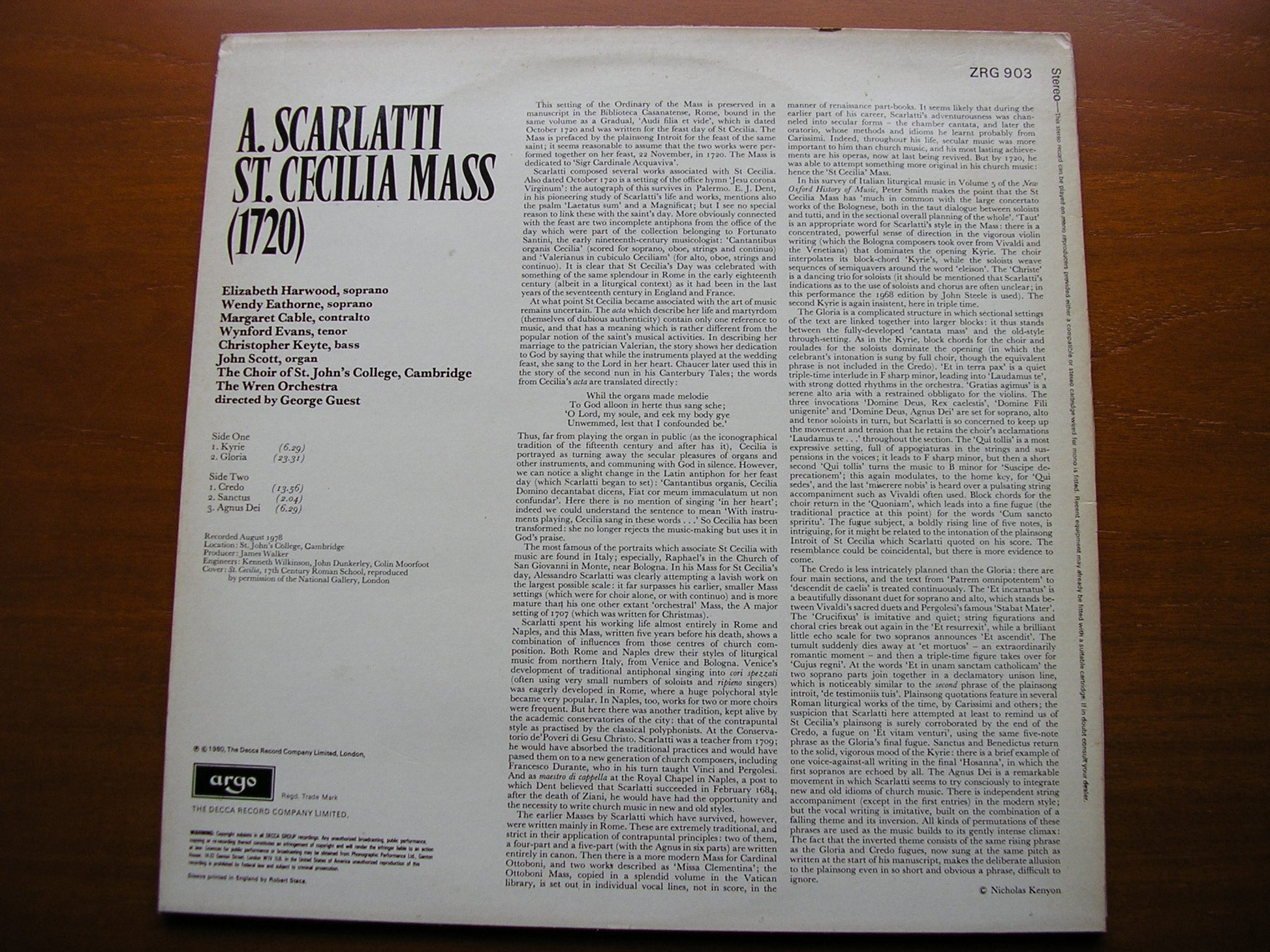 ZRG 903  SCARLATTI: SAINT CECILIA MASS   ELIZABETH HARWOOD / WENDY EATHORNE / MARGARET CABLE / WYNFORD EVANS / CHRISTOPHER KEYTE / CHOIR OF SAINT JOHN'S COLLEGE CAMBRIDGE / THE WREN ORCHESTRA / GEORGE GUEST