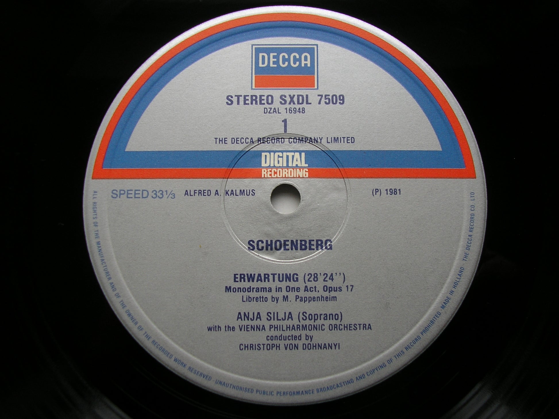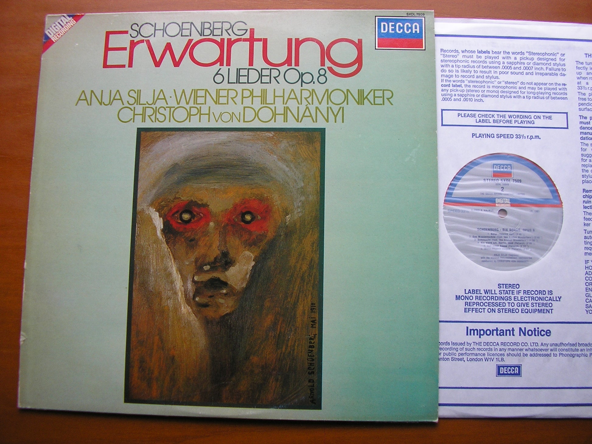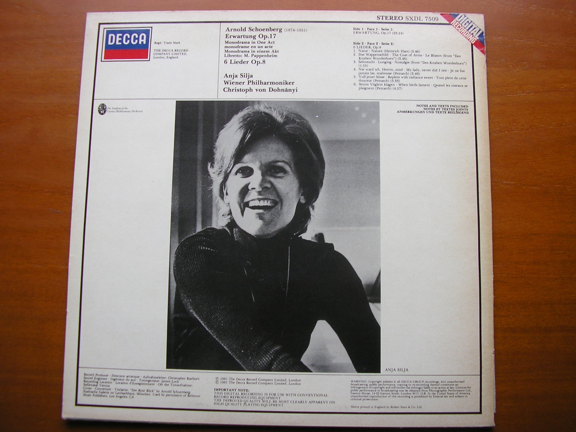SXDL 7509  SCHOENBERG: ERWARTUNG / SIX LIEDER Op. 8     ANJA SILJA / VIENNA PHILHARMONIC ORCHESTRA / CHRISTOPH VON DOHNANYI