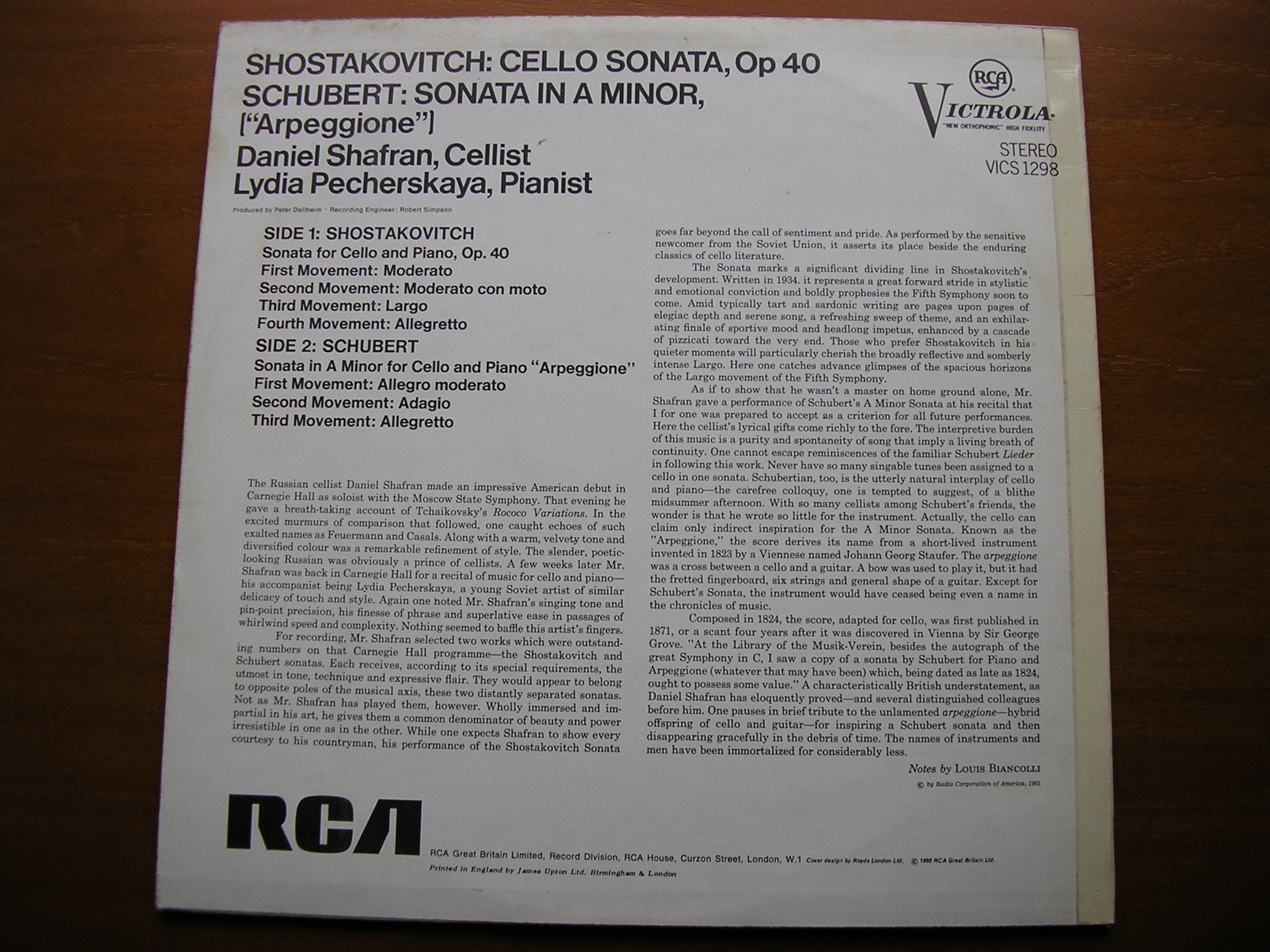 VICS 1298  SCHUBERT: ARPEGGIONE SONATA / SHOSTAKOVICH: CELLO SONATA   DANIEL SHAFRAN / LYDIA PECHERSKAYA