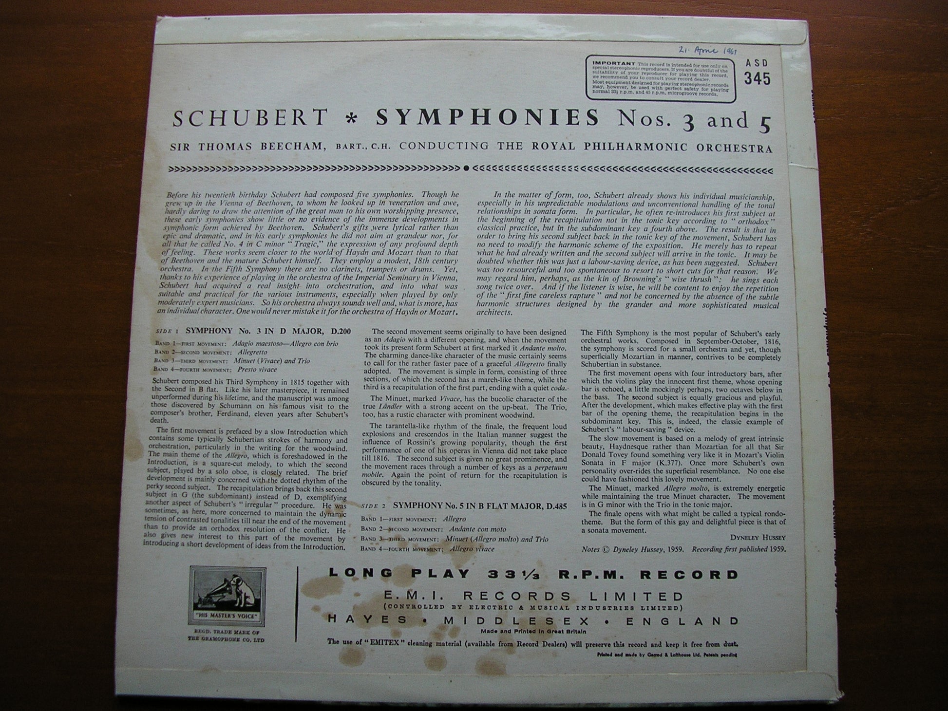 ASD 345  SCHUBERT: SYMPHONIES Nos. 3 & 5   SIR THOMAS BEECHAM / ROYAL PHILHARMONIC ORCHESTRA