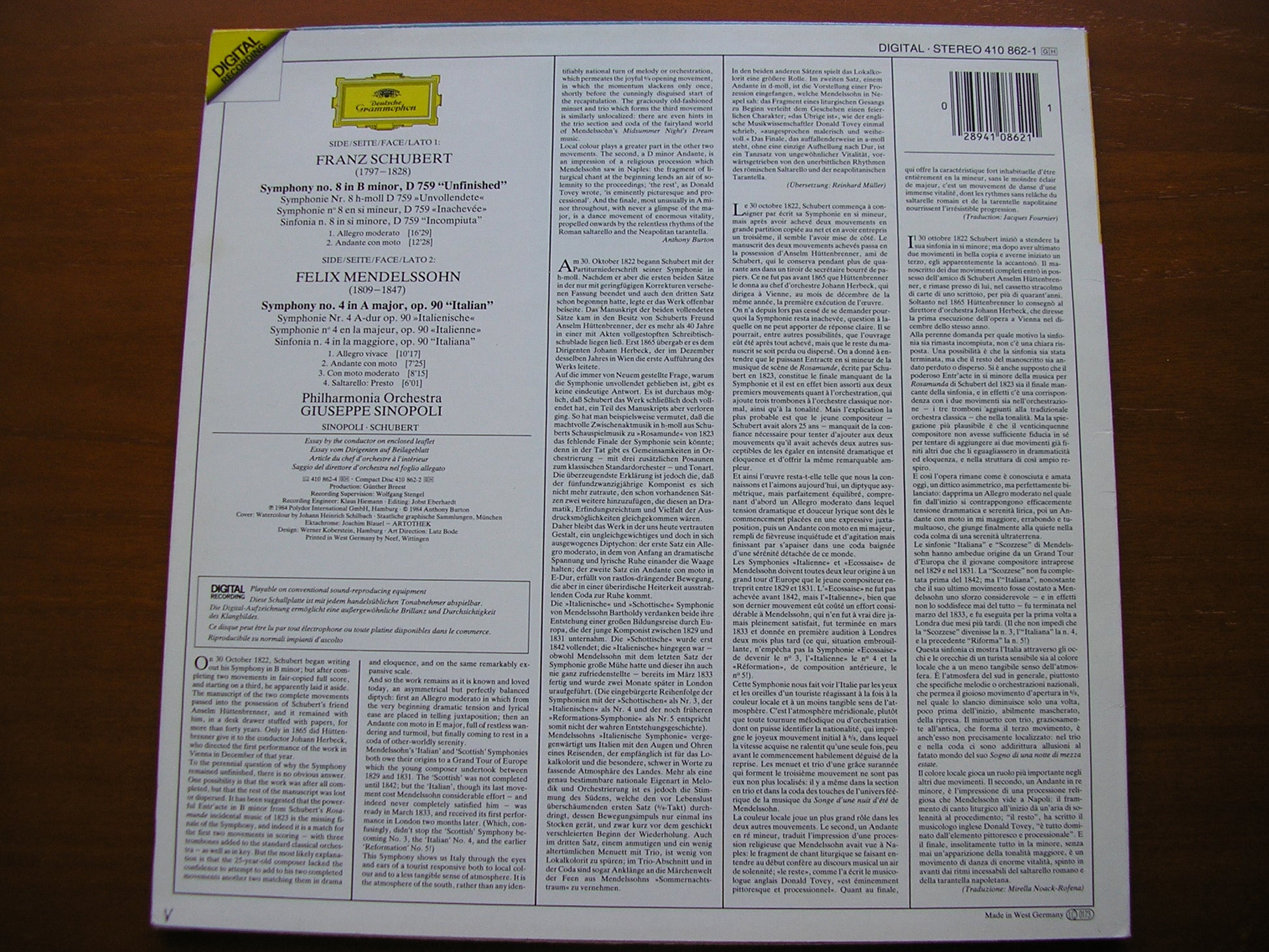 410 862  SCHUBERT: UNFINISHED SYMPHONY / MENDELSSOHN: SYMPHONY No. 4  GIUSEPPE SINOPOLI / PHILHARMONIA ORCHESTRA