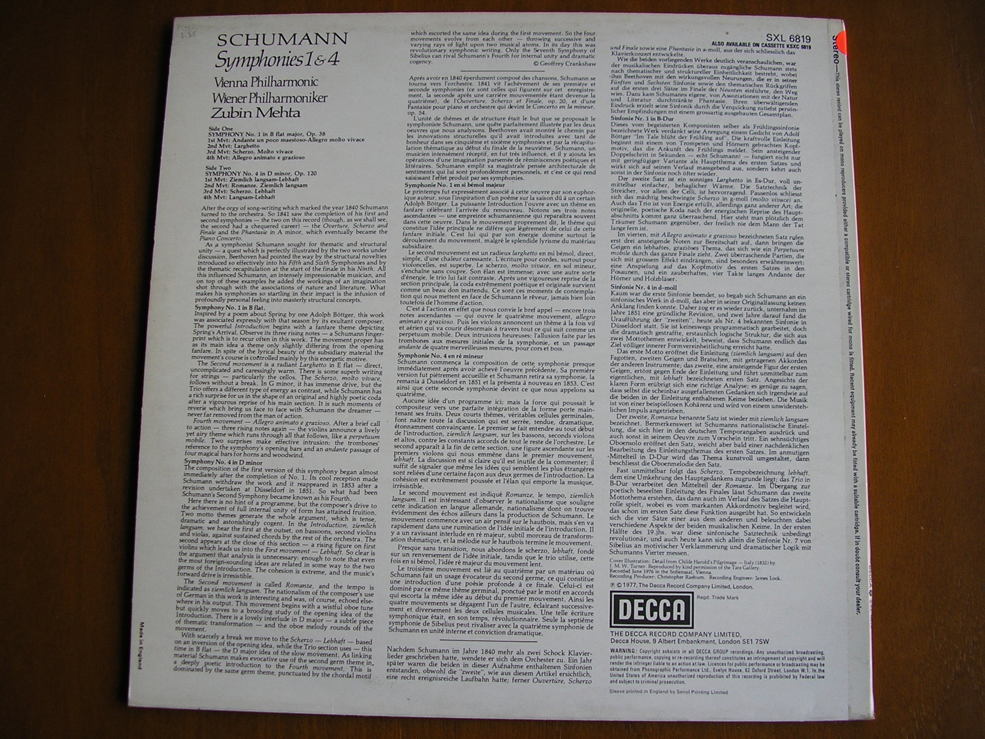 SXL 6819  SCHUMANN: SYMPHONIES Nos. 1 & 4    ZUBIN MEHTA / VIENNA PHILHARMONIC ORCHESTRA