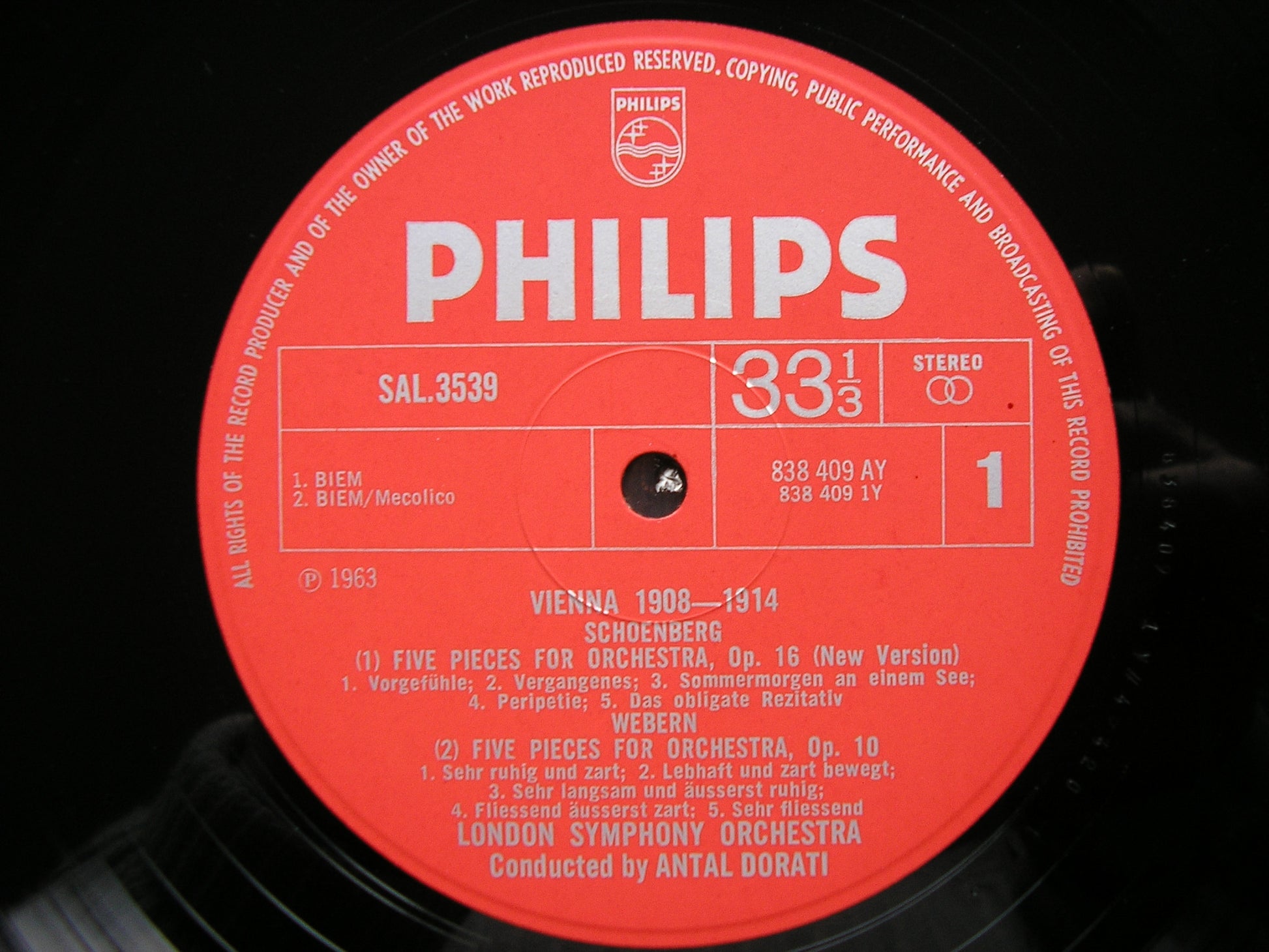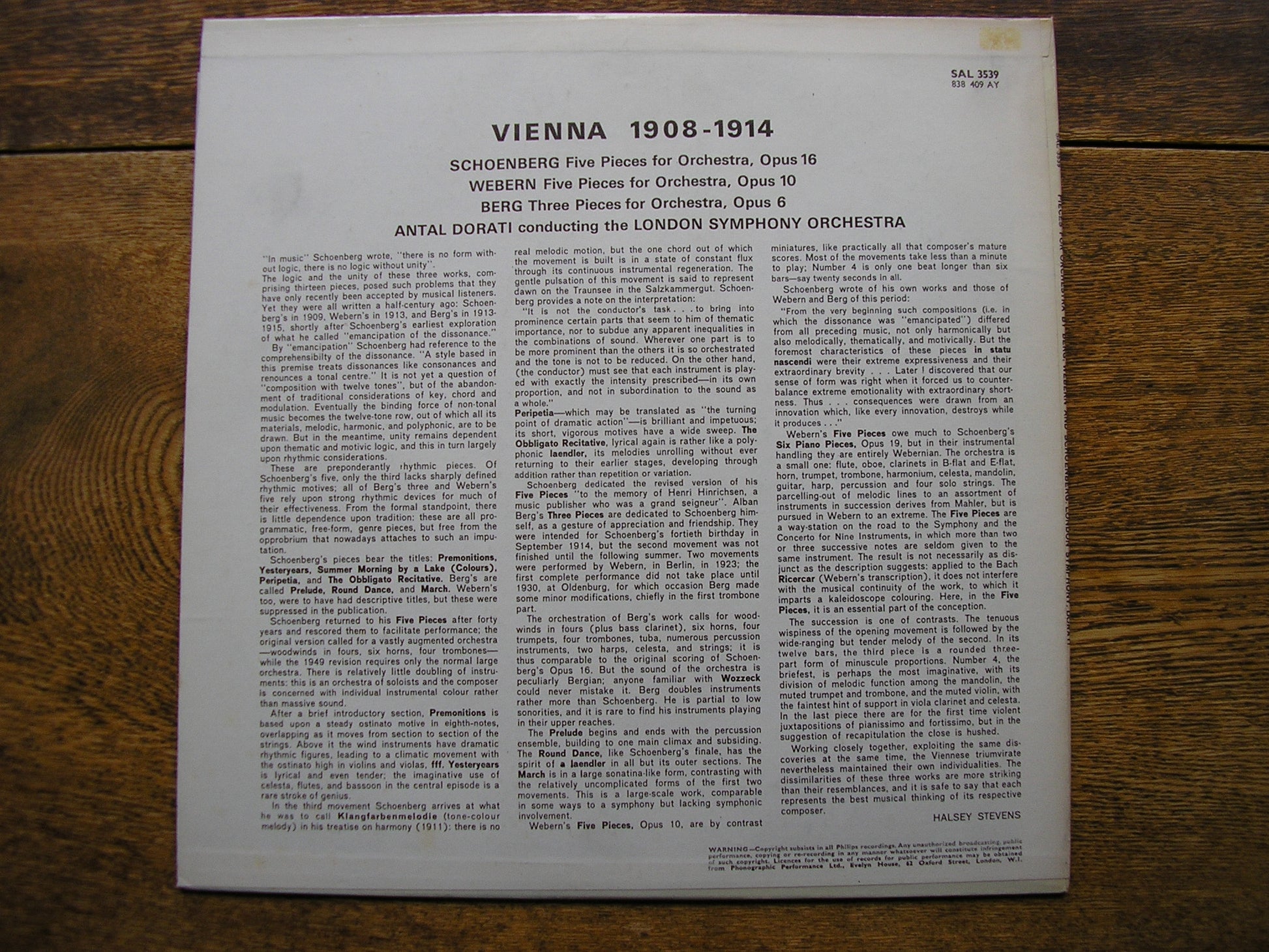 SAL 3539  VIENNA 1908 - 1914   SCHOENBERG: 5 PIECES FOR ORCHESTRA Op. 16 / WEBERN: 5 PIECES FOR ORCHESTRA Op. 10 / BERG: 3 PIECES FOR ORCHESTRA Op. 6    ANTAL DORATI / LONDON SYMPHONY ORCHESTRA