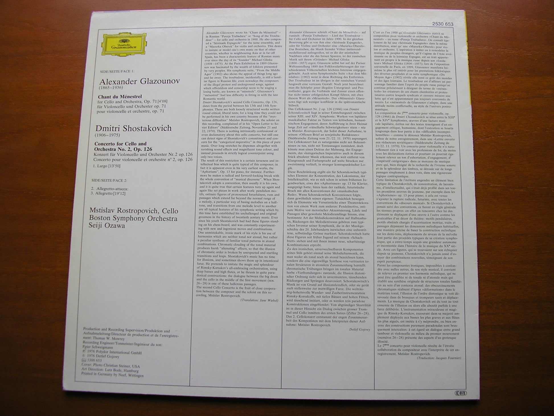 2530 653 SHOSTAKOVICH: CELLO CONCERTO No. 2 / GLAZOUNOV: CHANT DU MENESTREL     MSTISLAV ROSTROPOVICH / BOSTON SYMPHONY ORCHESTRA / SEIJI OZAWA