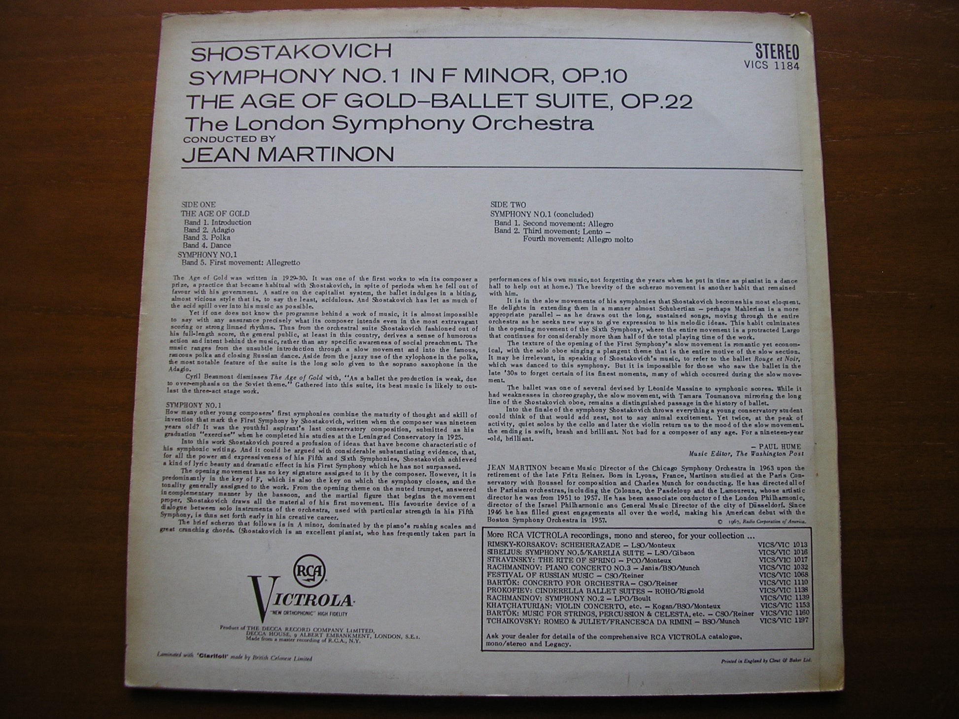 VICS 1184  SHOSTAKOVICH: SYMPHONY No. 1 / THE AGE OF GOLD Ballet Suite    JEAN MARTINON / LONDON SYMPHONY ORCHESTRA