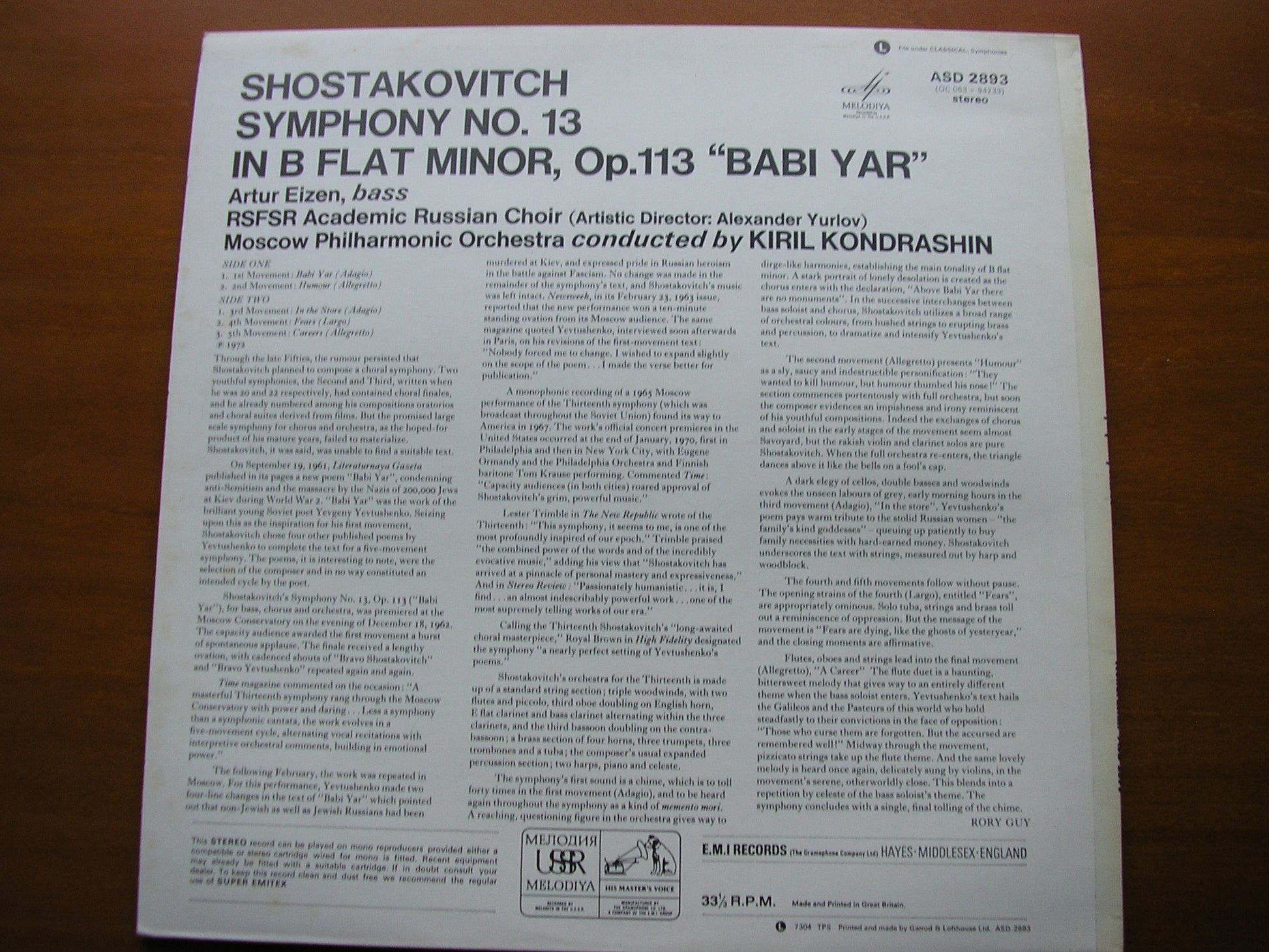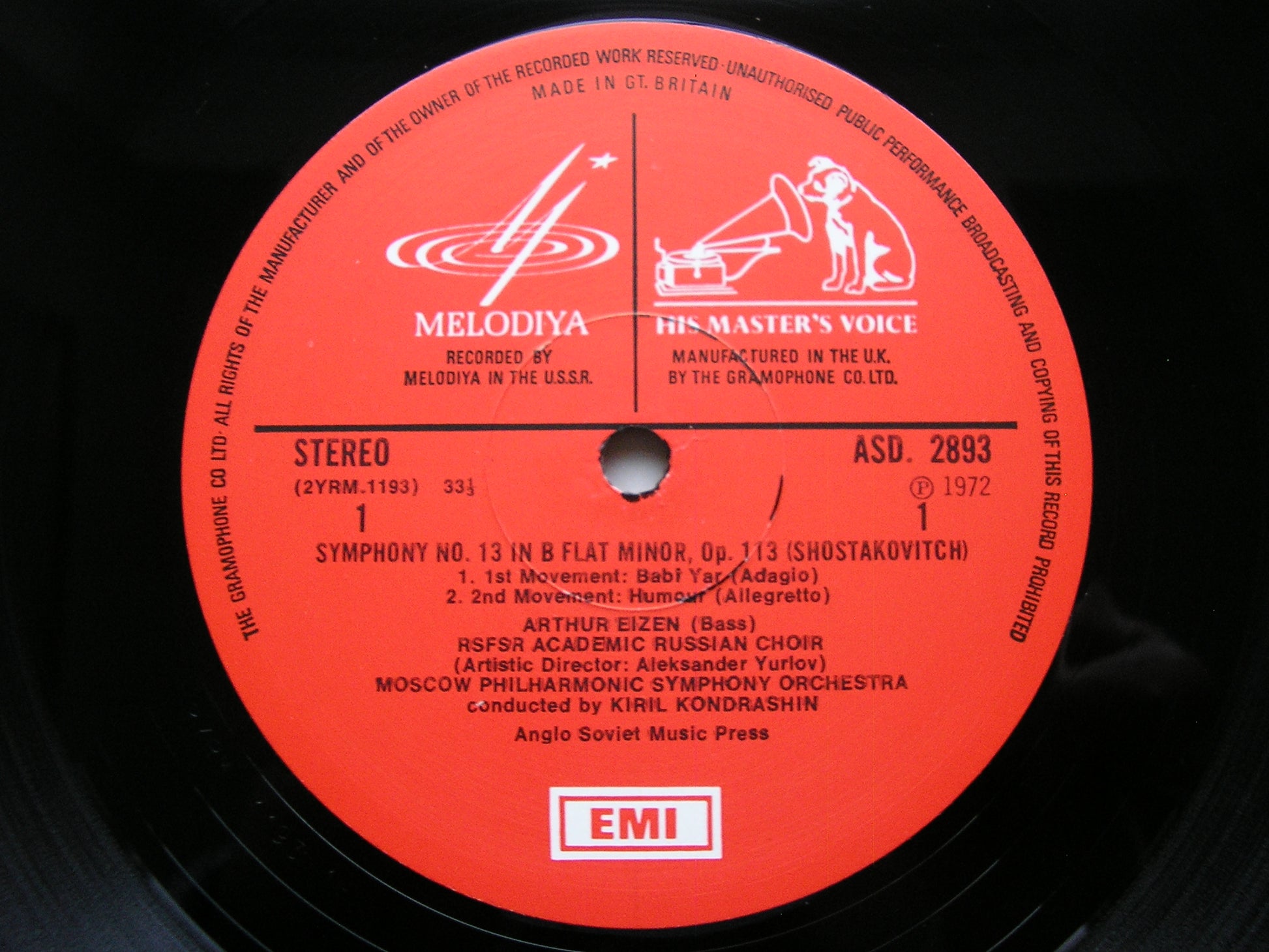 ASD 2893  SHOSTAKOVICH: SYMPHONY No. 13      ARTUR EIZEN / MOSCOW PHILHARMONIC ORCHESTRA / KIRIL KONDRASHIN