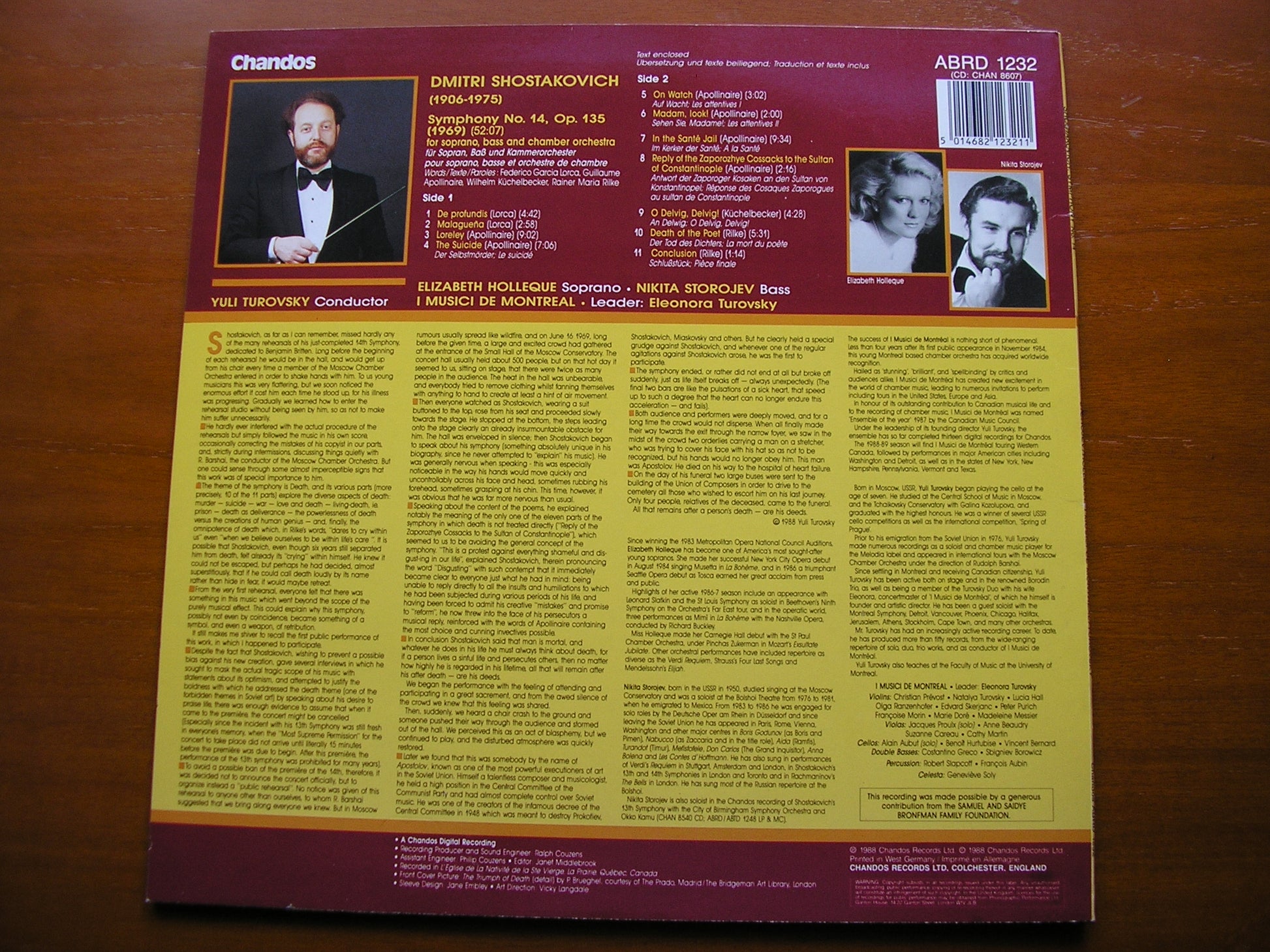ABRD 1232  SHOSTAKOVICH: SYMPHONY No. 14   ELIZABETH HOLLEQUE / NIKITA STOROJEV / I MUSICI DE MONTREAL / YULI TUROVSKY