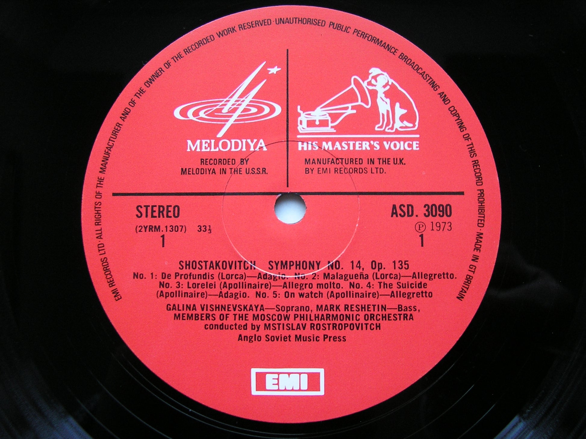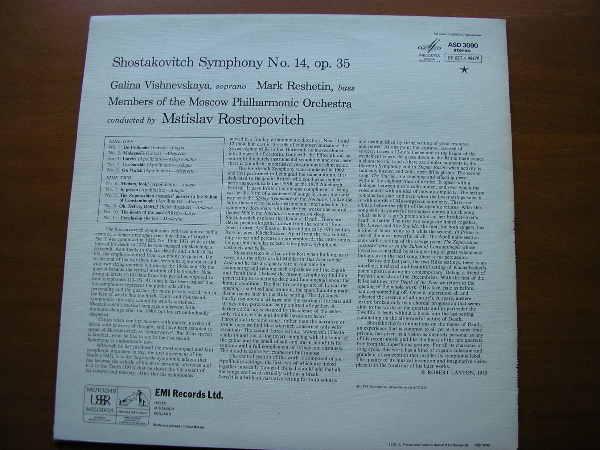 ASD 3090  SHOSTAKOVICH: SYMPHONY No. 14       GALINA VISHNEVSKAYA / MARK RESHETIN / MOSCOW PHILHARMONIC / MSTISLAV ROSTROPOVICH