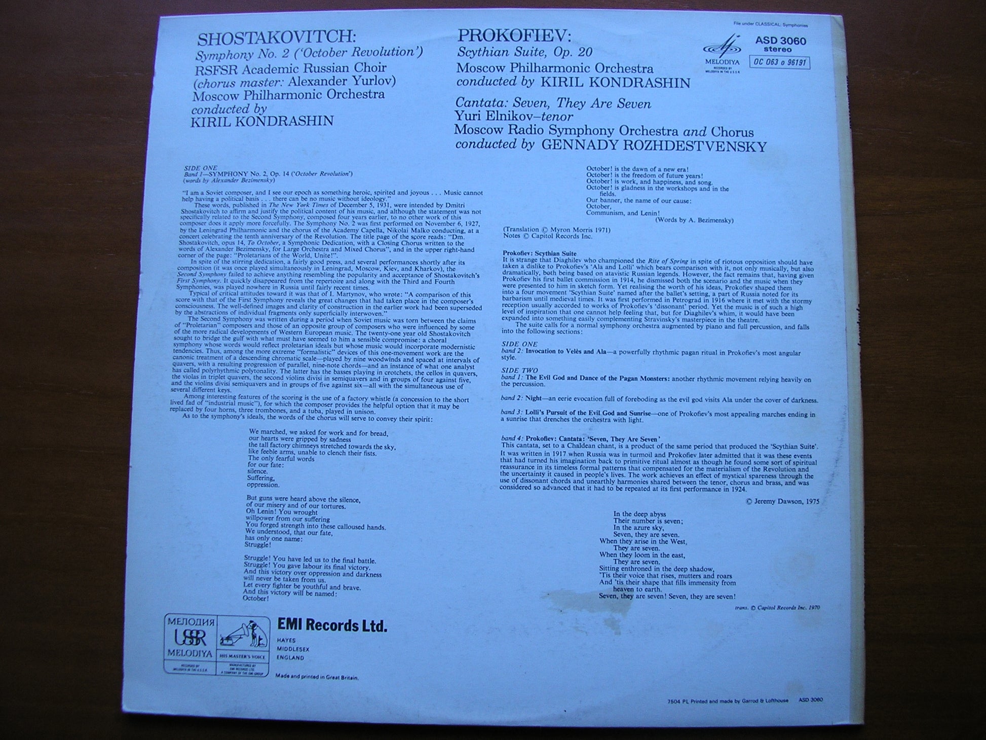 ASD 3060  SHOSTAKOVICH: SYMPHONY No. 2 / PROKOFIEV: SCYTHIAN SUITE / SEVEN, THEY ARE SEVEN       KIRIL KONDRASHIN / MOSCOW PHILHARMONIC & GENNADY ROZHDESTVENSKY / MOSCOW RADIO SYMPHONY ORCHESTRA
