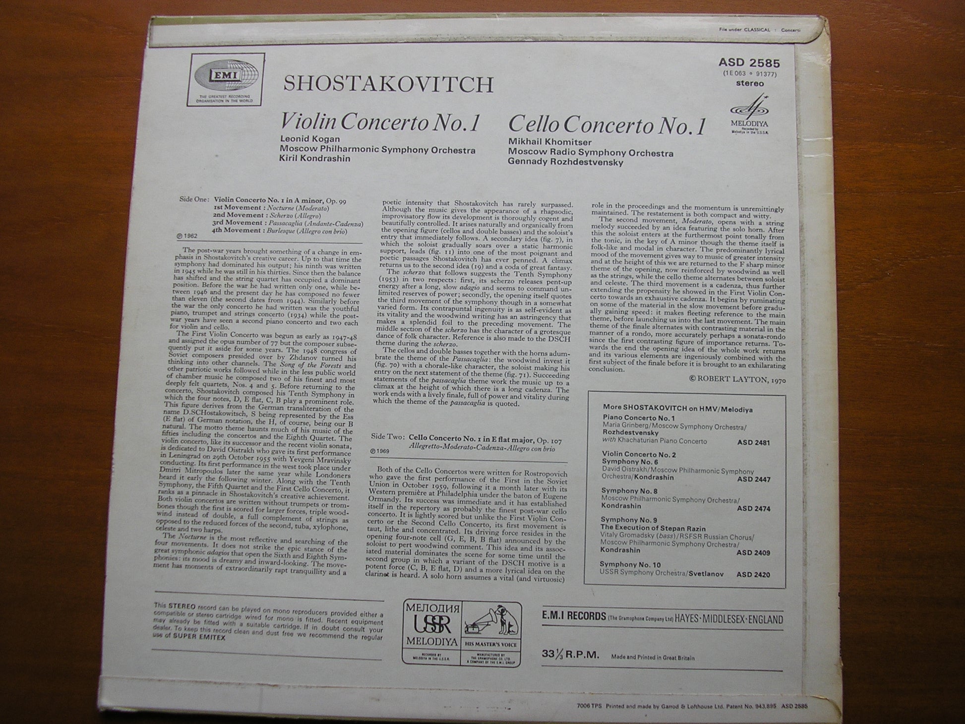 SHOSTAKOVICH: VIOLIN CONCERTO / CELLO CONCERTO KOGAN / KHOMITSER / MRSO / KONDRASHIN ASD 2585