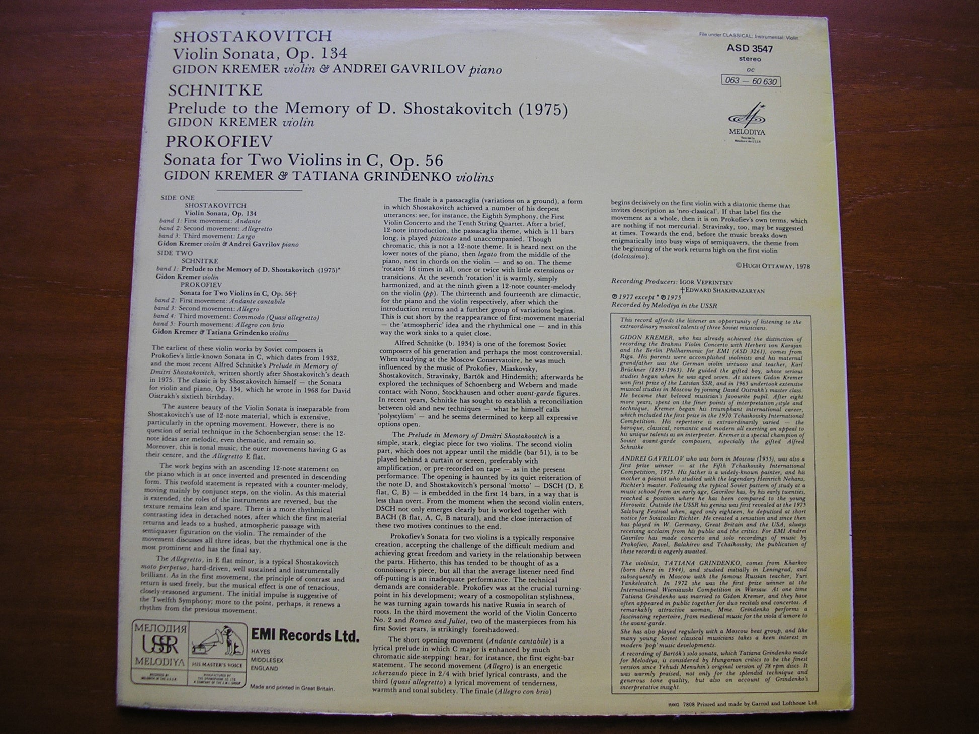 ASD 3547  SHOSTAKOVICH: VIOLIN SONATA Op. 134 / SCHNITKE: PRELUDE / PROKOFIEV: SONATA FOR TWO VIOLINS Op. 56    ANDREI GAVRILOV / GIDON KREMER /  TATIANA GRINDENKO