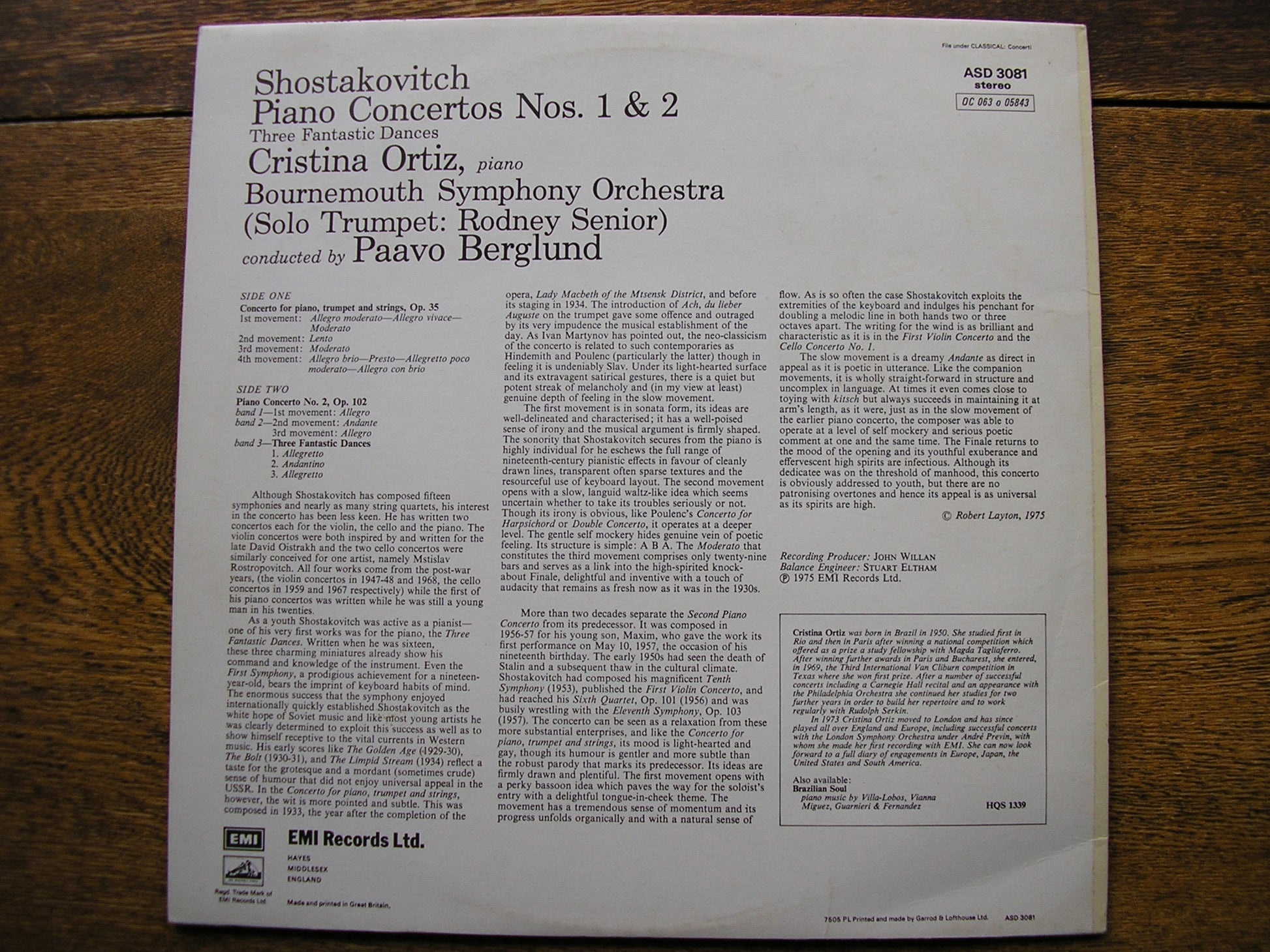 ASD 3081  SHOSTAKOVITCH: PIANO CONCEROS Nos. 1 & 2    CRISTINA ORTIZ / BOURNEMOUTH SYMPHONY ORCHESTRA / PAAVO BERGLUND
