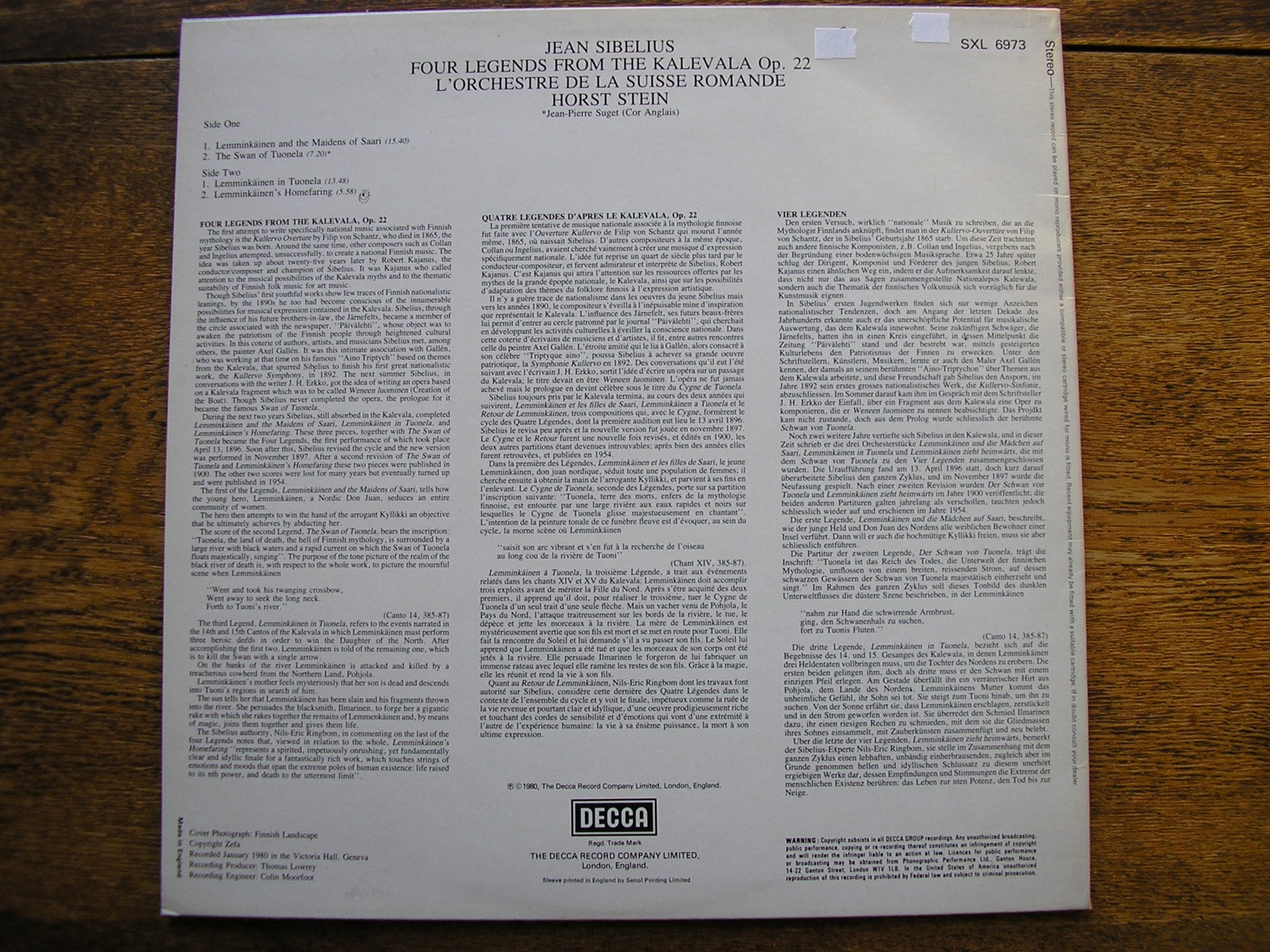 SXL 6973 SIBELIUS: FOUR LEGENDS FROM THE KALEVALA    HORST STEIN / SUISSE ROMANDE ORCHESTRA