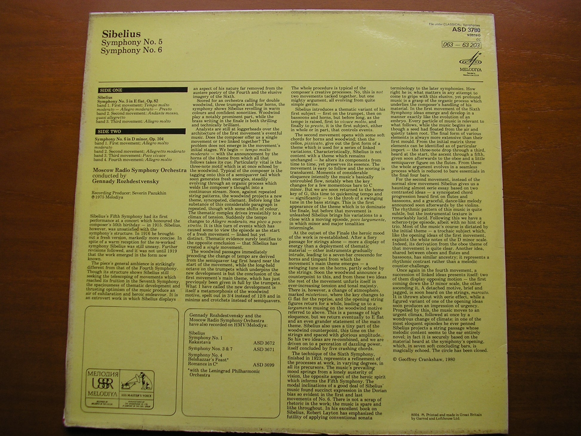 ASD 3780  SIBELIUS: SYMPHONIES Nos. 5 & 6    GENNADI ROZHDESTVENSKY / MOSCOW RADIO SYMPHONY ORCHESTRA