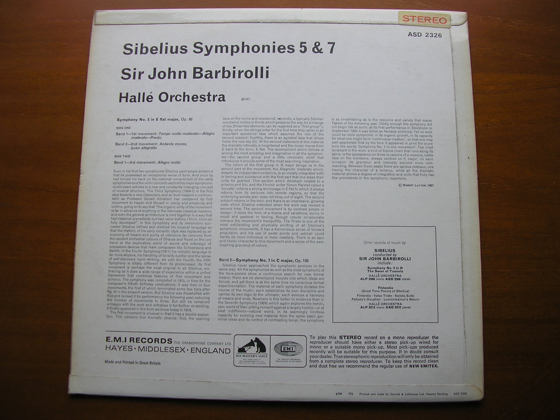 ASD 2326  SIBELIUS: SYMPHONIES Nos. 5 & 7   SIR JOHN BARBIROLLI / HALLE ORCHESTRA