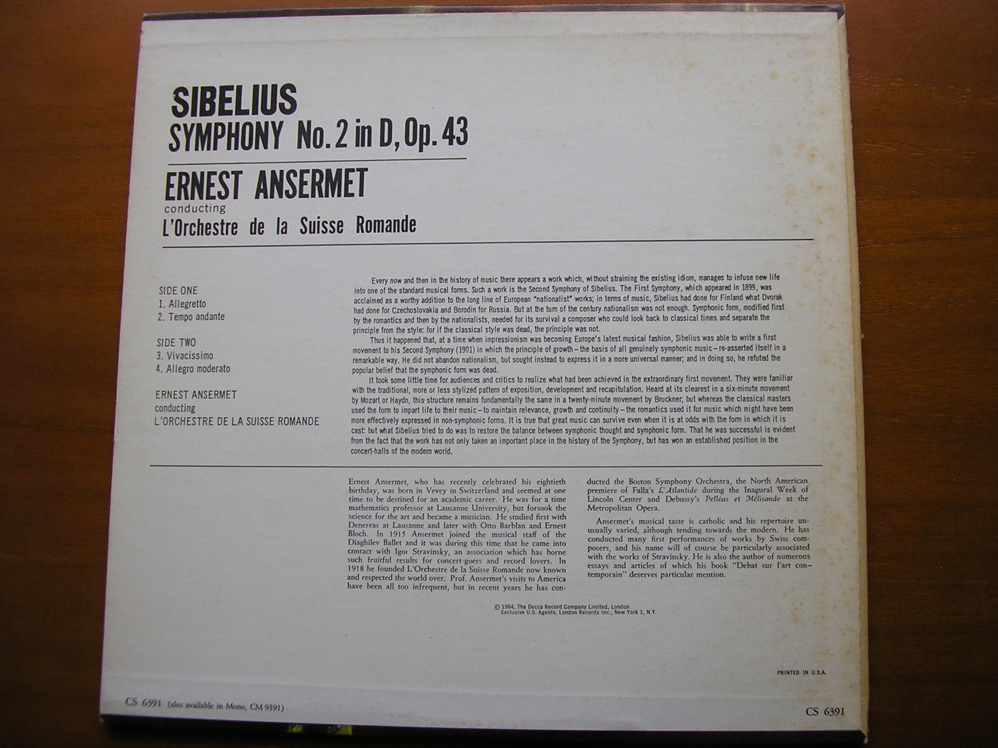 CS 6391  SIBELIUS: SYMPHONY No. 2             ERNEST ANSERMET / SUISSE ROMANDE ORCHESTRA