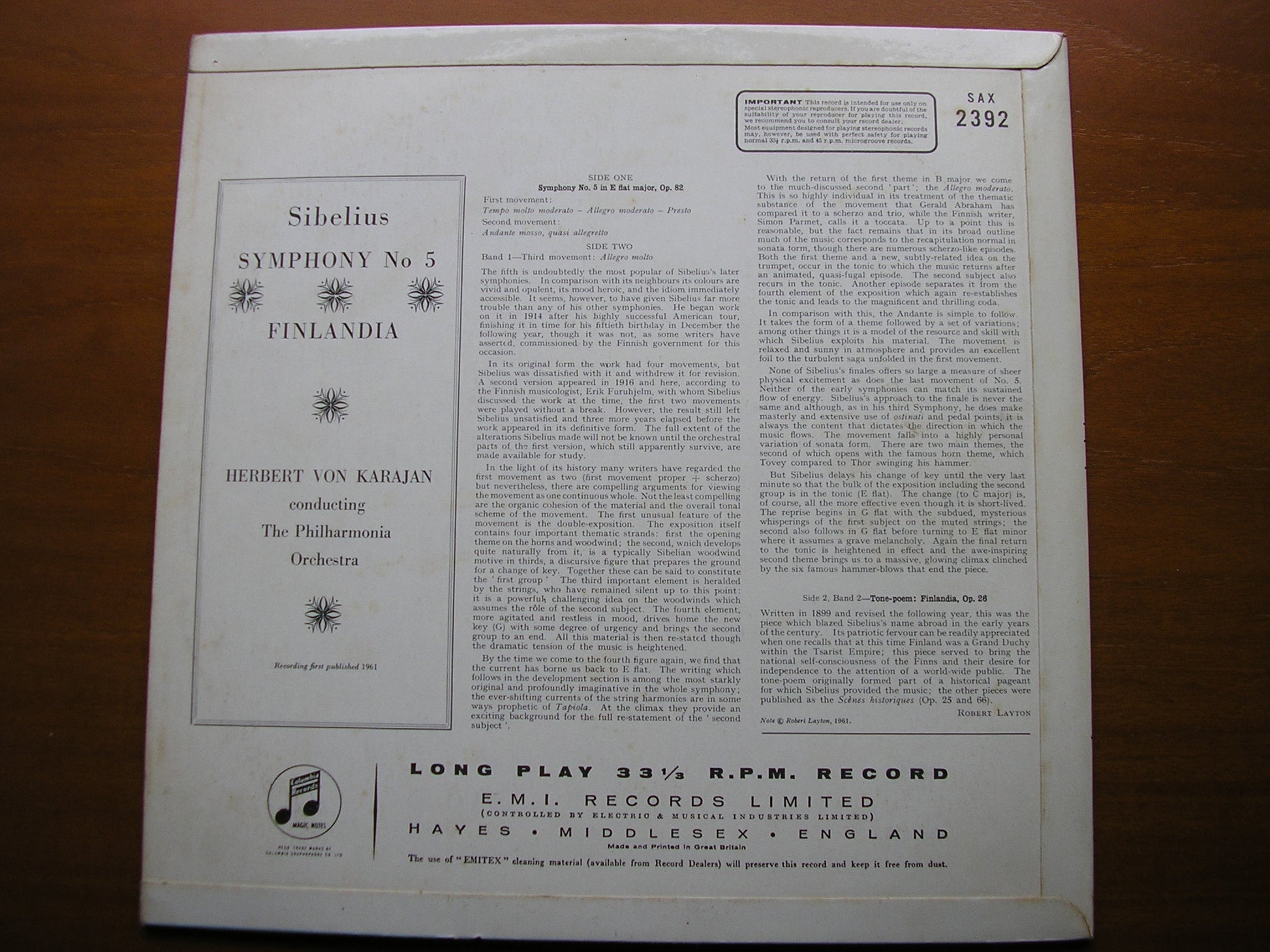 SAX 2392  SIBELIUS: SYMPHONY No. 5 / FINLANDIA      HERBERT VON KARAJAN / PHILHARMONIA ORCHESTRA