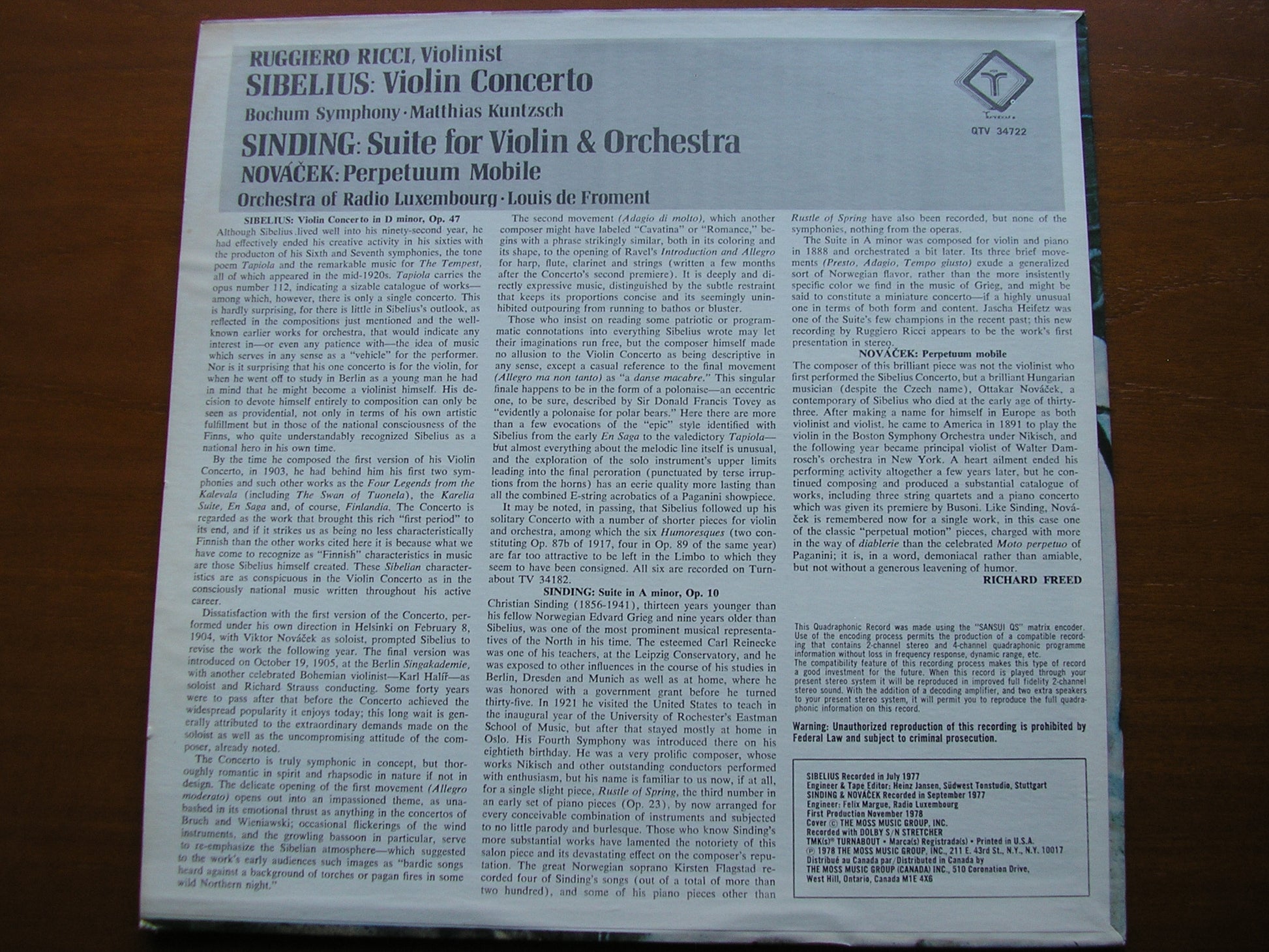 SIBELIUS: VIOLIN CONCERTO / SINDING: SUITE Op. 10 / NOVACEK: PERPETUUM MOBILE RICCI / RADIO LUXEMOURG / FROMENT QTV 34722