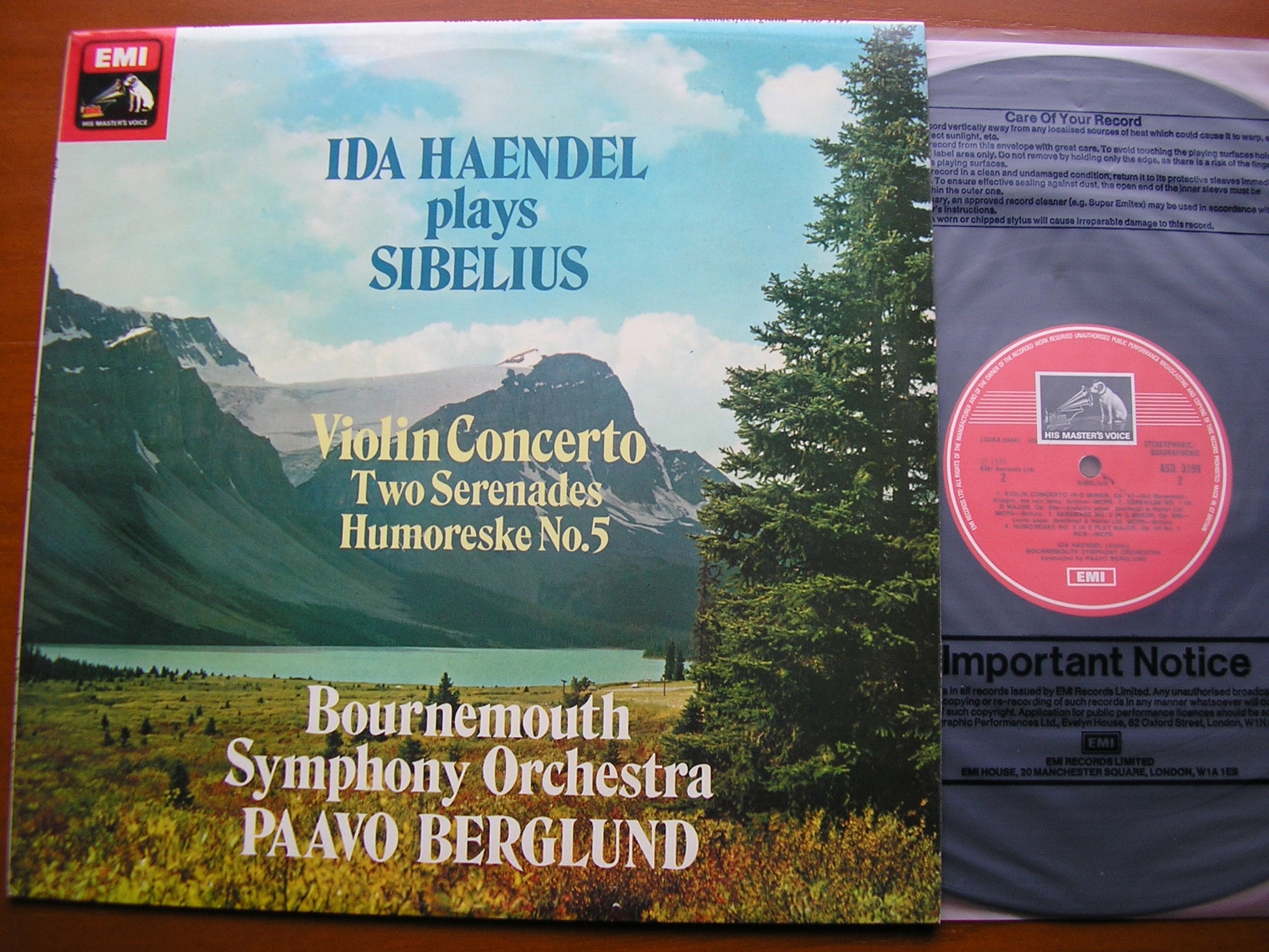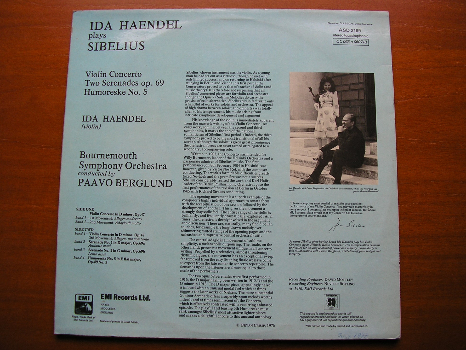 ASD 3199  SIBELIUS: VIOLIN CONCERTO / TWO SERENADES / HUMORESKE  IDA HAENDEL / BOURNEMOUTH SYMPHONY ORCHESTRA / PAAVO BERGLUND