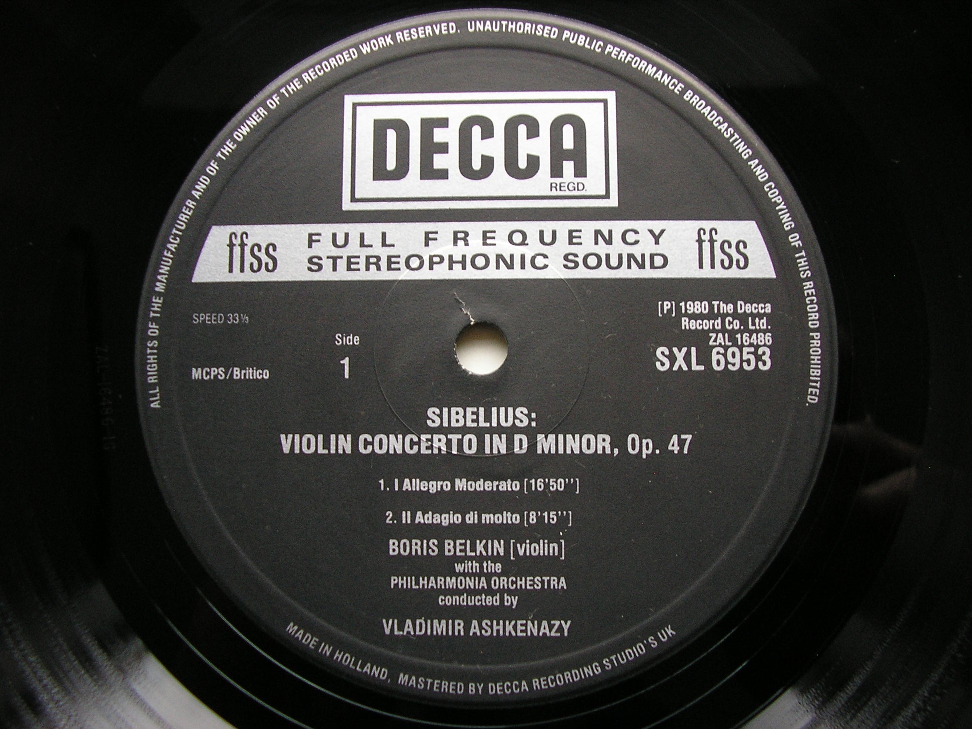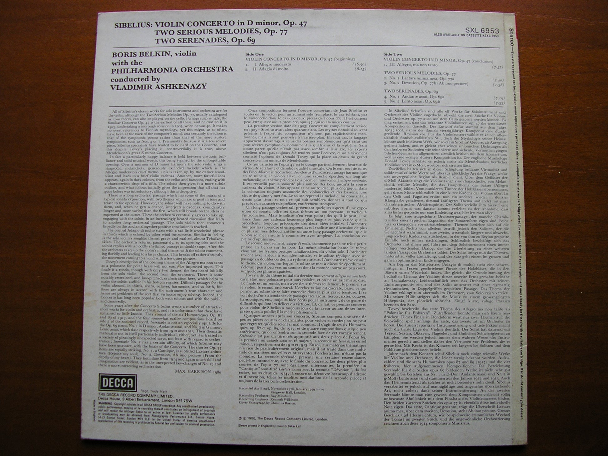 SXL 6953  SIBELIUS: VIOLIN CONCERTO / TWO SERENADES / TWO SERIOUS MELODIES     BORIS BELKIN / PHILHARMONIA ORCHESTRA / VLADIMIR ASHKENAZY