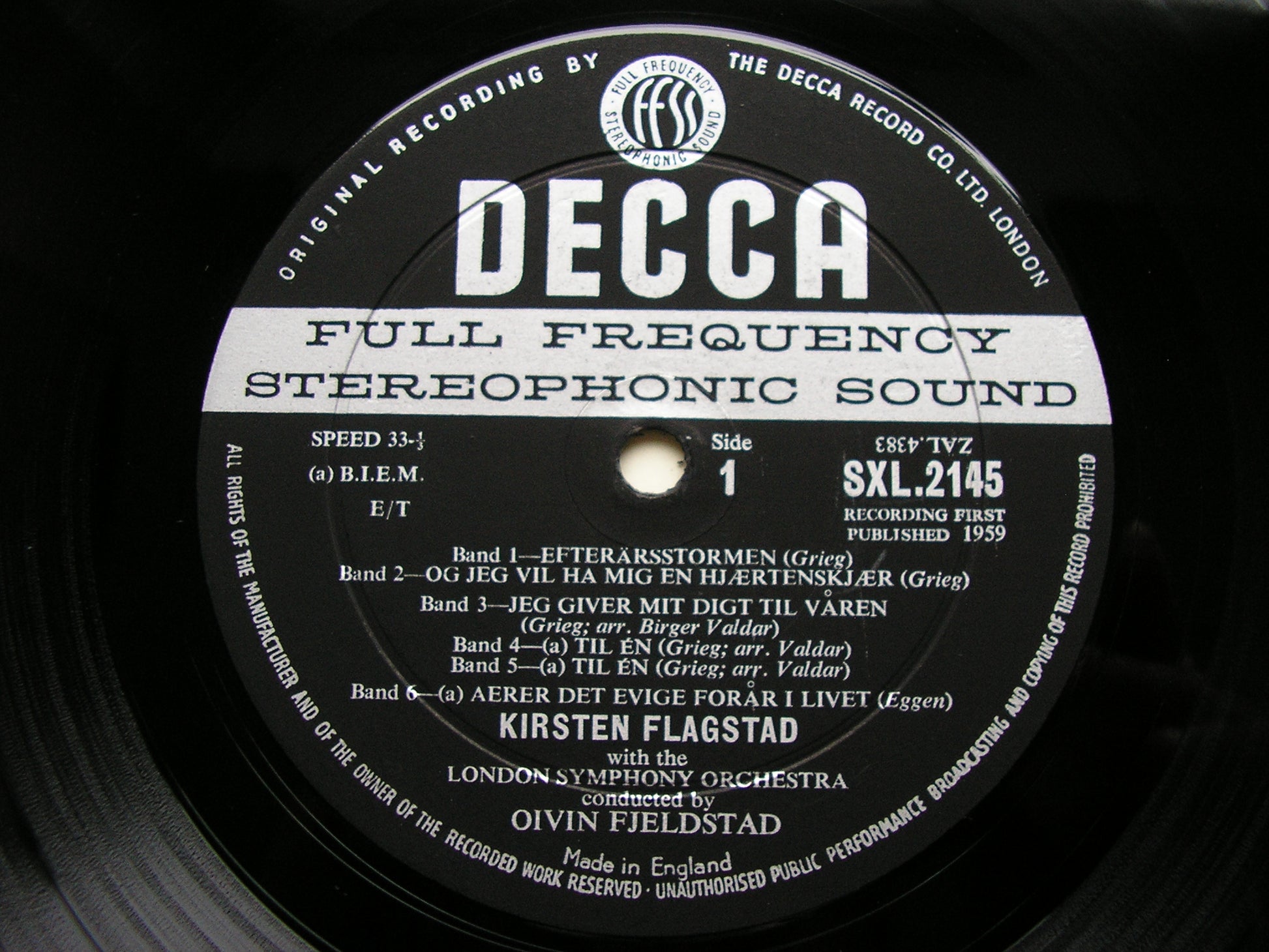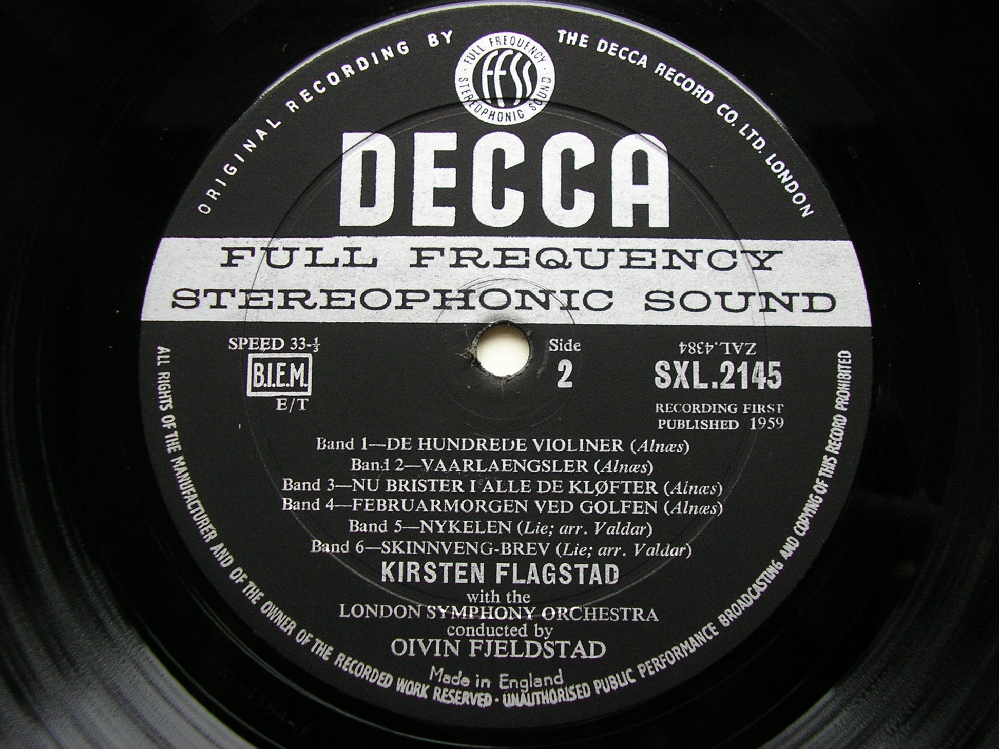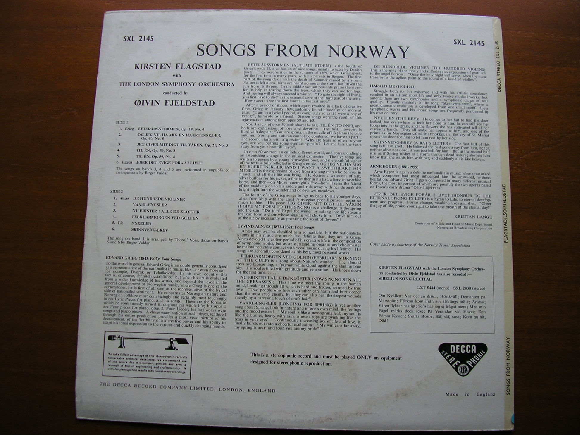 SXL 2145  SONGS FROM NORWAY: GRIEG / EGGEN / ALNAES      KIRSTEN FLAGSTAD / LONDON SYMPHONY ORCHESTRA / OIVIN FJELSTAD