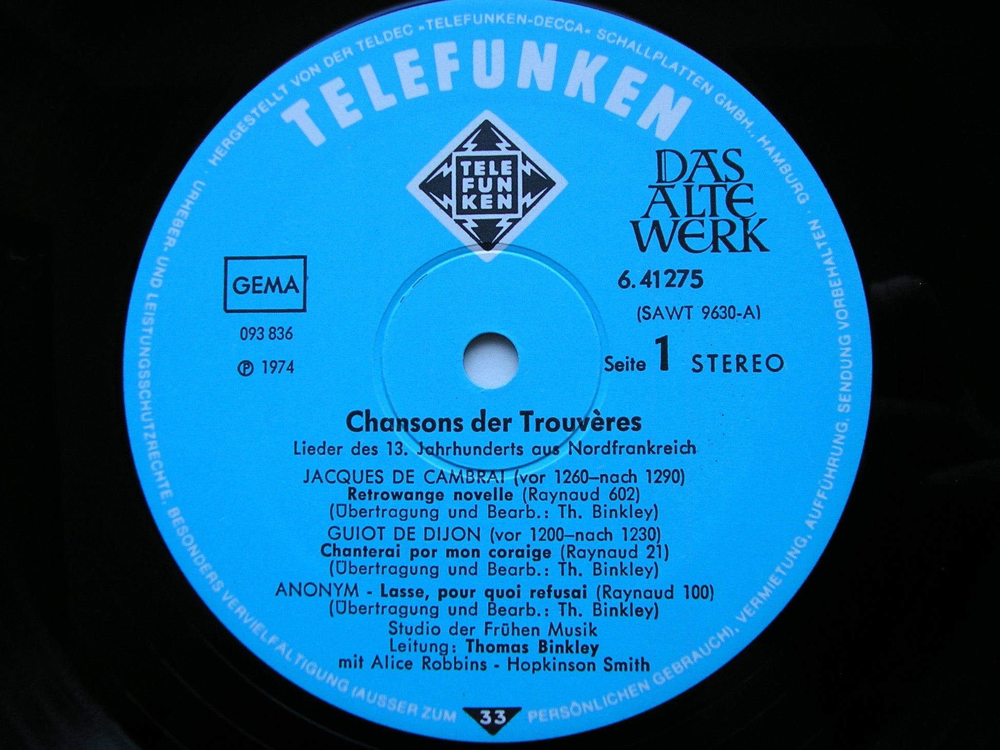 6.41275  SONGS OF THE TROUVERES FROM THE 13th CENTURY: JACQUES DE CAMBRAI / GUIOT DE DIJON / DE BERNEVILLE / BRULE / DE MEAUX     THE STUDIO OF EARLY MUSIC / THOMAS BINKLEY